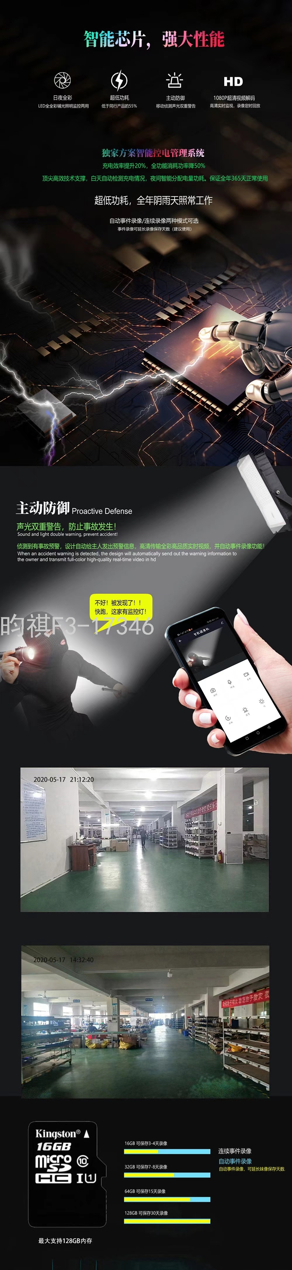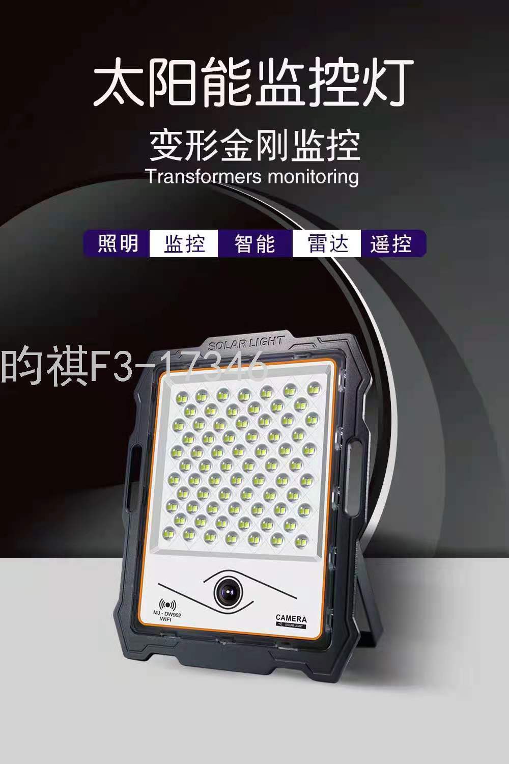 产品特点:监控摄像功能,1080P超清视频解码,高清实时监视,录像定时回放。日夜全彩,超低功耗。移动侦测声光双重警告,主动防御。阴雨天照常工作,白天充电,高品质量,保证全年正常使用,2000万像素,高亮灯珠。带智能遥控,雷达感应。