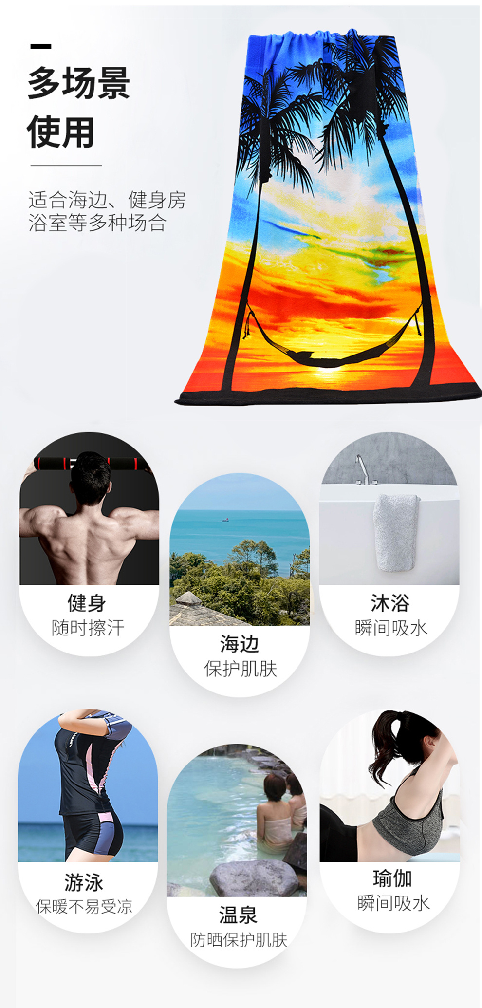 产品名称:沙滩巾 产品尺寸:咨询客服 产品材质:咨询客服 产品颜色:如图 产品特点:吸水速干,防晒防风