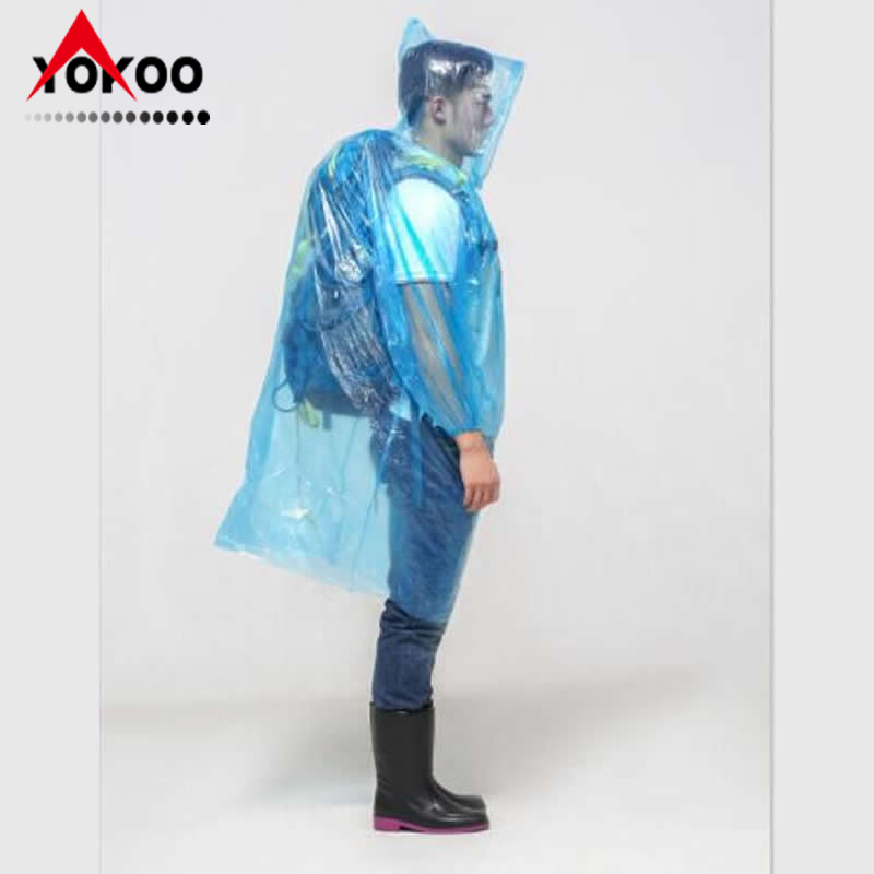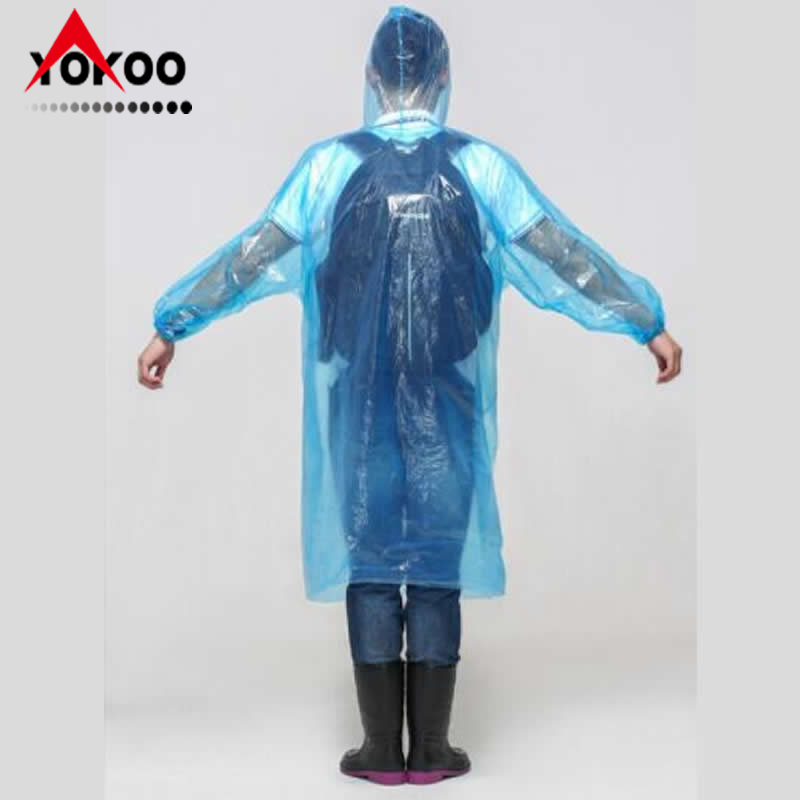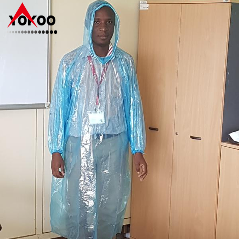 PE套头一次性雨衣,一般厚度为0.015-0.04mm, 袖口有橡筋,帽子带帽绳,可根据客户要求定制。