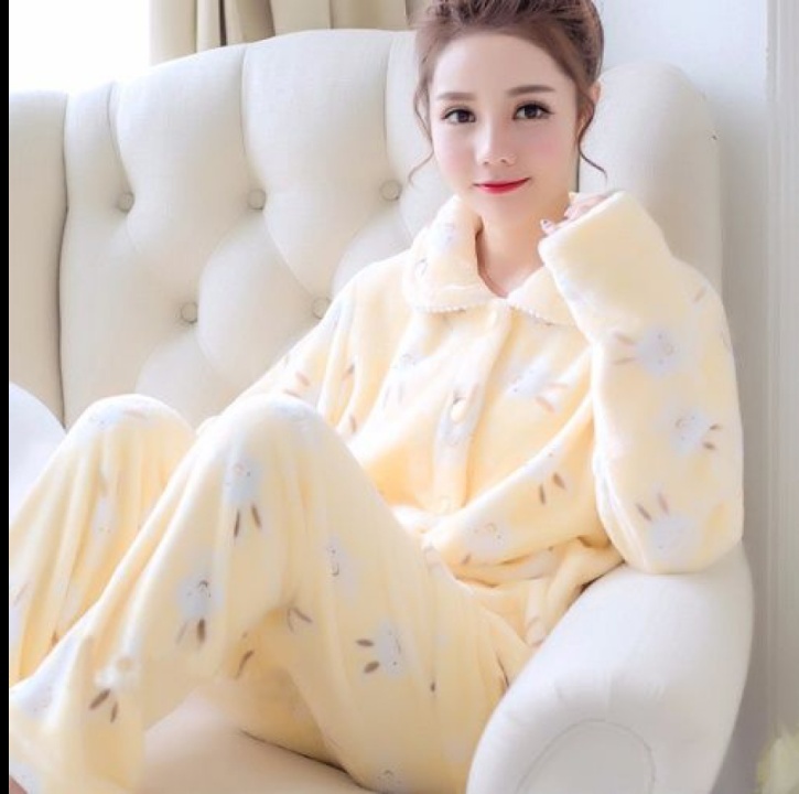 睡衣女秋冬季厚款珊瑚绒套装家居服加绒可爱法兰绒长袖开衫大码 投诉