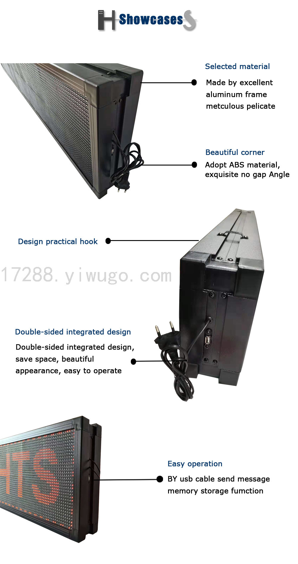 1. 展示能力:各种语言、文字、数字和符号。文字信息的字体大小可以调整,滚动速度可以调整,显示的亮度可以调整。