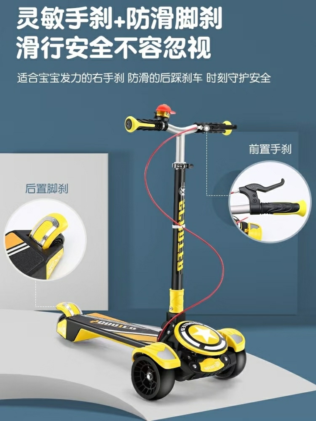 童车,新款儿童滑板车,带手刹,车头前置减震