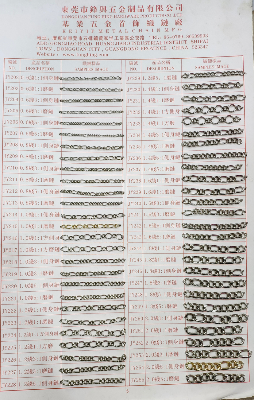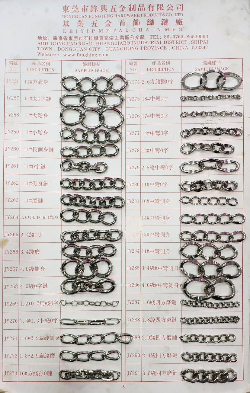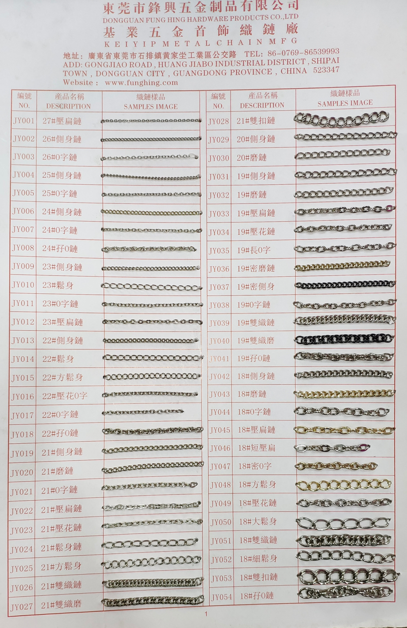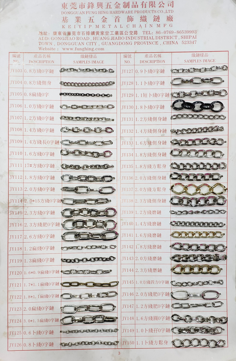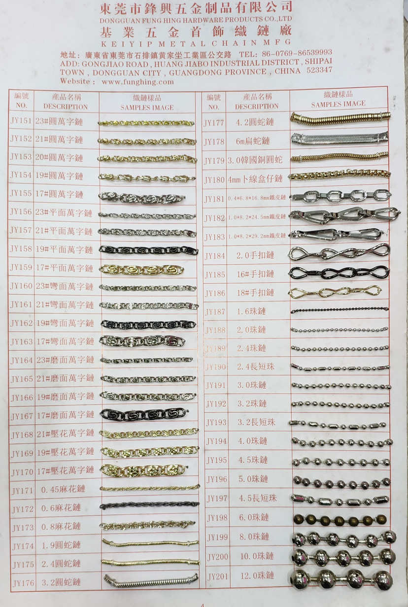 • 我司主要生产产品有两大类。专业生产五金链条,手袋链,蛇链,饰品链,万字链,珠链,NK链,灯饰链等。专业生产设计制造锌合金压铸,奖牌,三档扣,弹簧圈,钩扣,锁头,装饰配件,吊钟,皮具合金,五金配件等