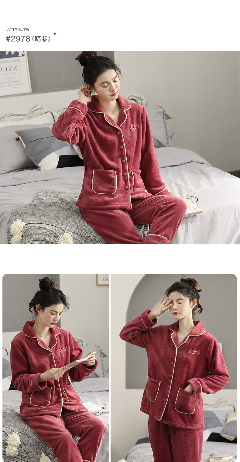 睡衣女冬季珊瑚绒加厚加绒圆领套头秋冬保暖法兰绒大码家居服套装