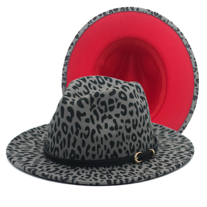 豹纹拼色礼帽大檐爵士帽子黑色皮带毛呢毡帽豹纹大红礼帽