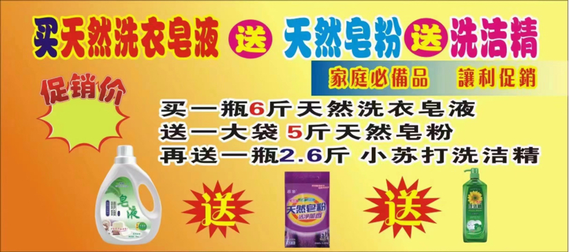地摊热卖小苏打洗衣皂液皂粉洗洁精日化三件套送广告布录音马甲