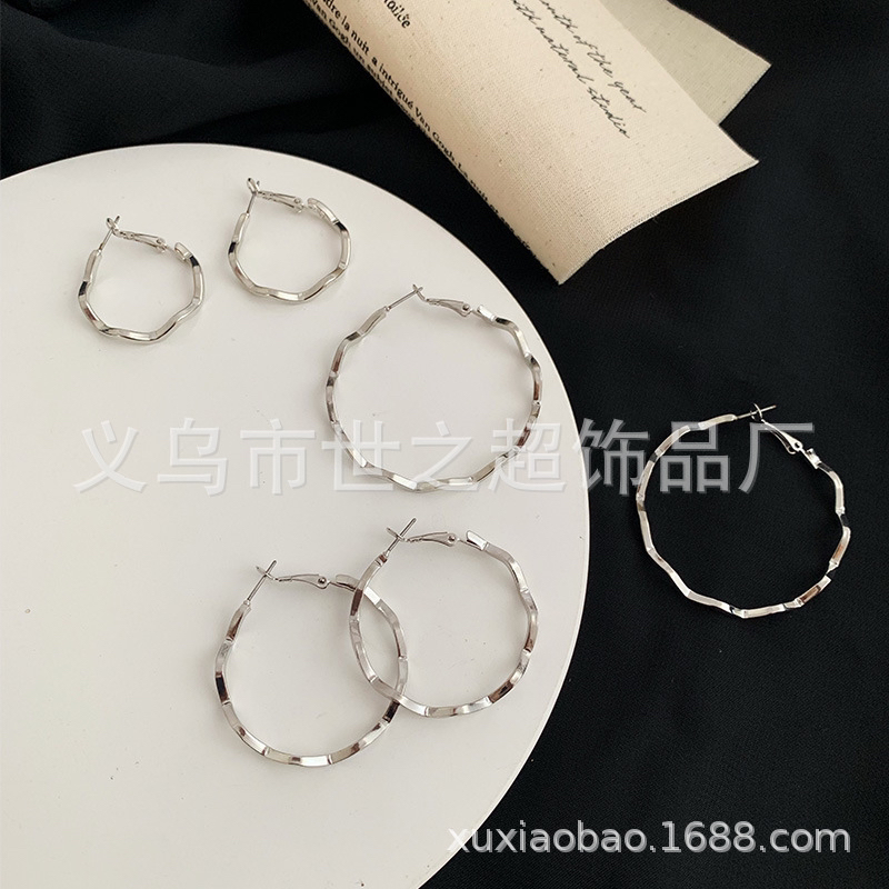 韩版波浪大耳环女款欧美夸张时尚耳圈百搭款厂家直销白钢色 English | 投诉