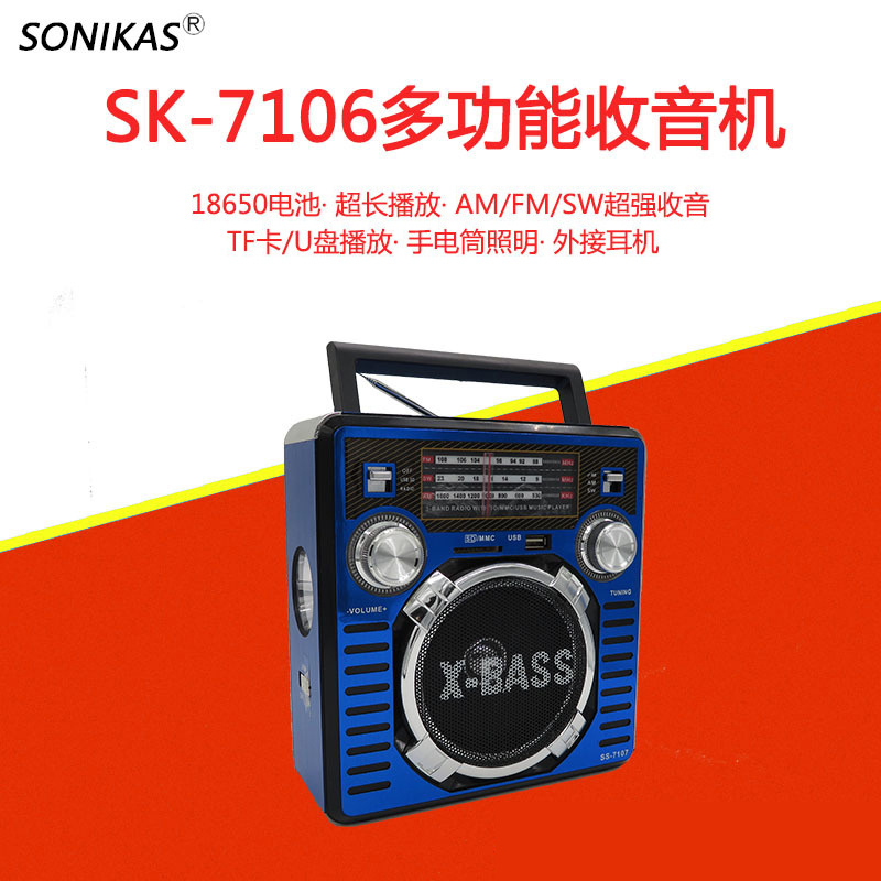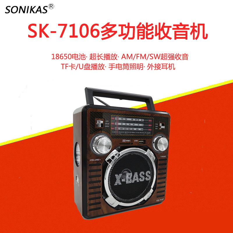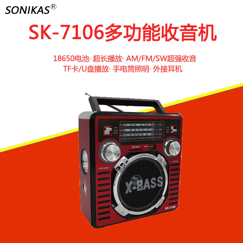 SK-7106USB 多波段指针式收音机FM/AM/SW 手提便携立式音响 插卡U盘MP3播放器 带手电筒照明