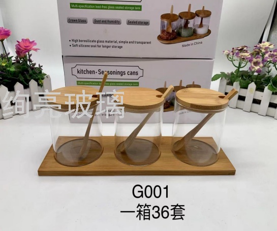 竹盖玻璃调味罐三件套带勺子 油瓶调味瓶储物罐圆形防潮罐