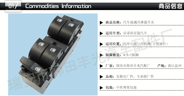 厂家直销 适用于雷诺科雷傲汽车左前车窗升降按钮7插25401-JY00C English | 投诉