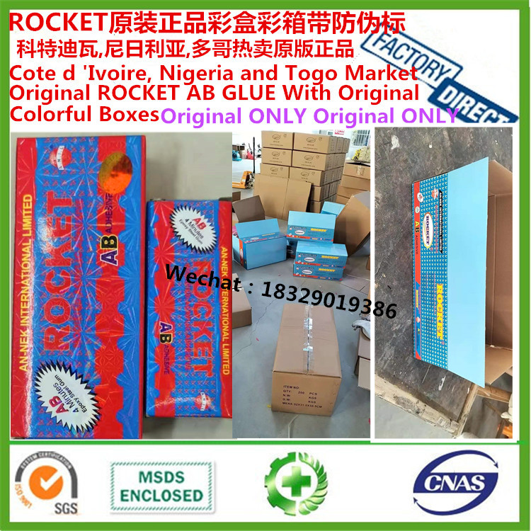 本厂专业供应尼日利亚市场胶水,ROCKET 正品爆款尼日利亚市场AB胶,可定牌,可定制客人LOGO,请选购正品款购买,谨防上当受骗。需要了解更多尼日利亚市场产品,请加客服微信哦。我们是源头工厂哟!