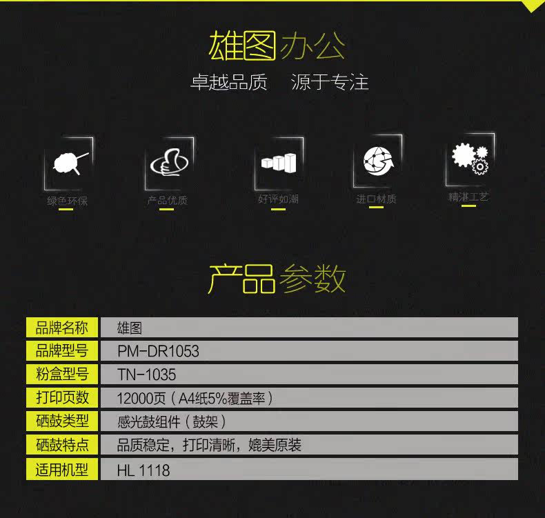 产品名称:兄弟鼓架 硒鼓型号:兄弟DR1035 适用机型:兄弟HL-1112 1118 1510 1518 1519 MFC-1818 MFC-1813 1819 产品颜色:黑色 打印页数:约12000页 A4幅面5%覆盖率