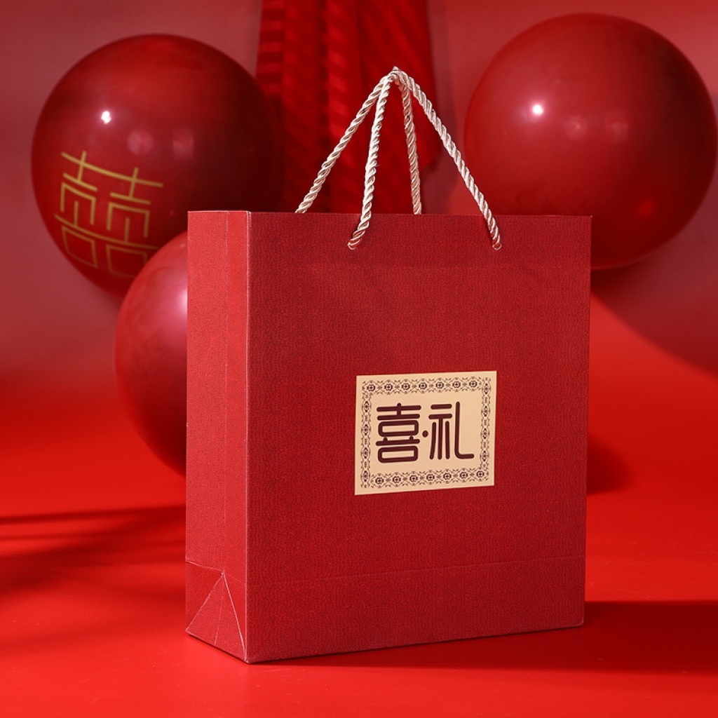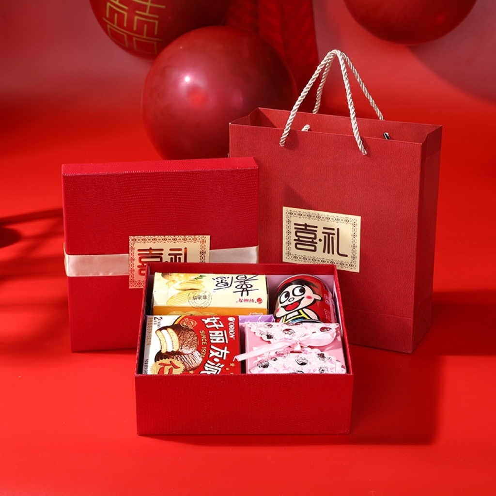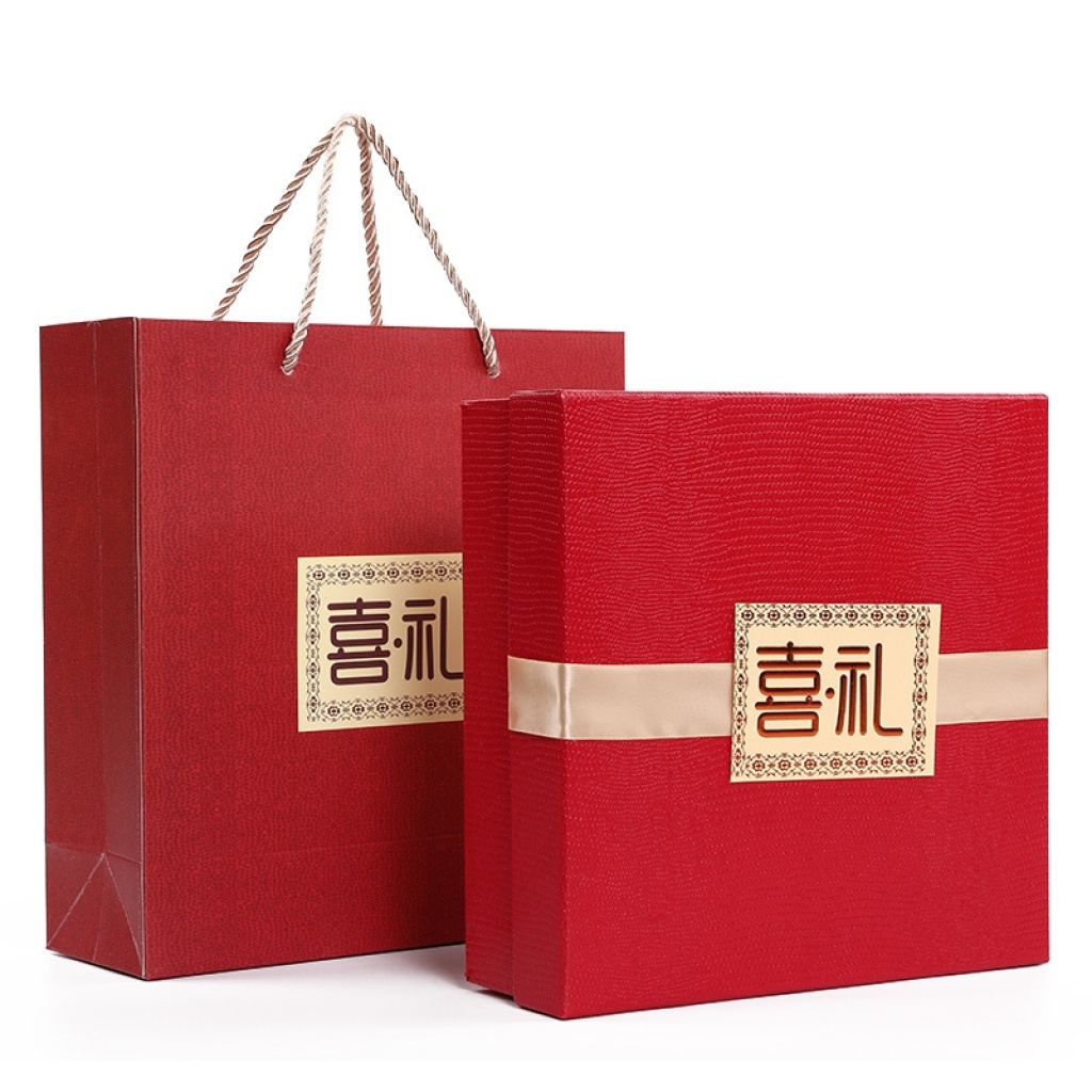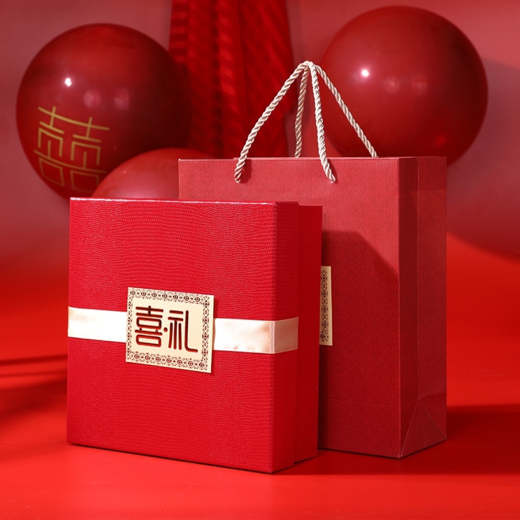 新款热销天地盖喜礼喜糖盒 中式红色喜庆婚庆礼品包装盒带手提袋