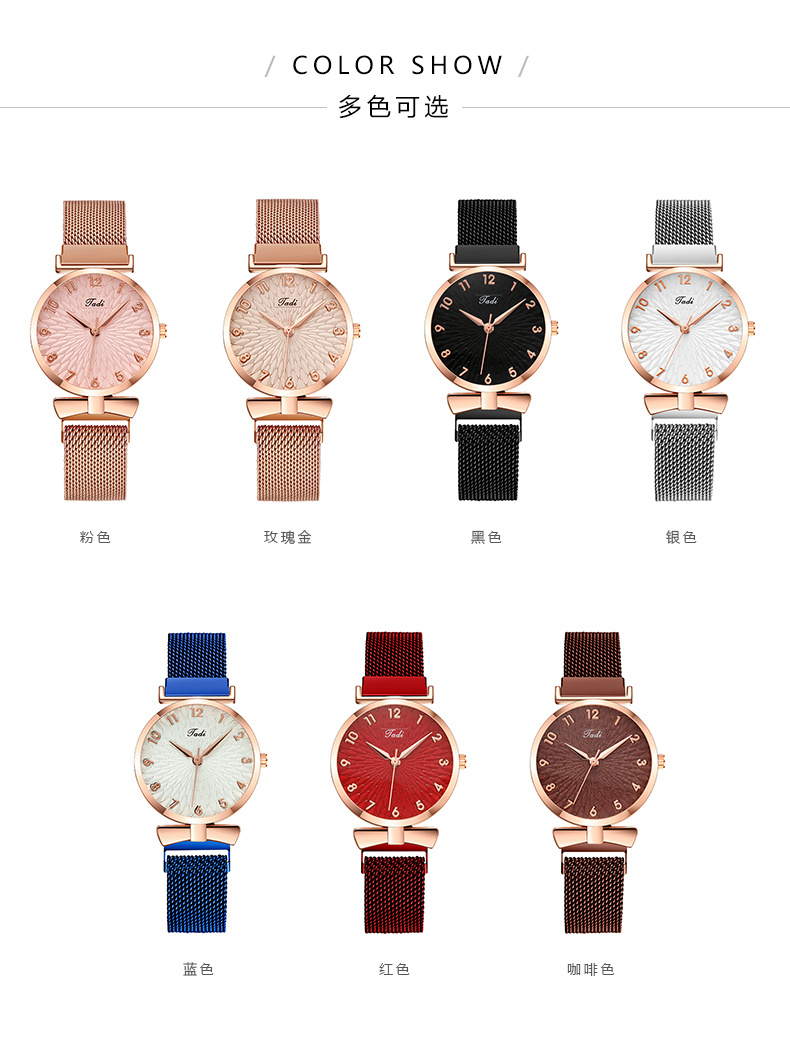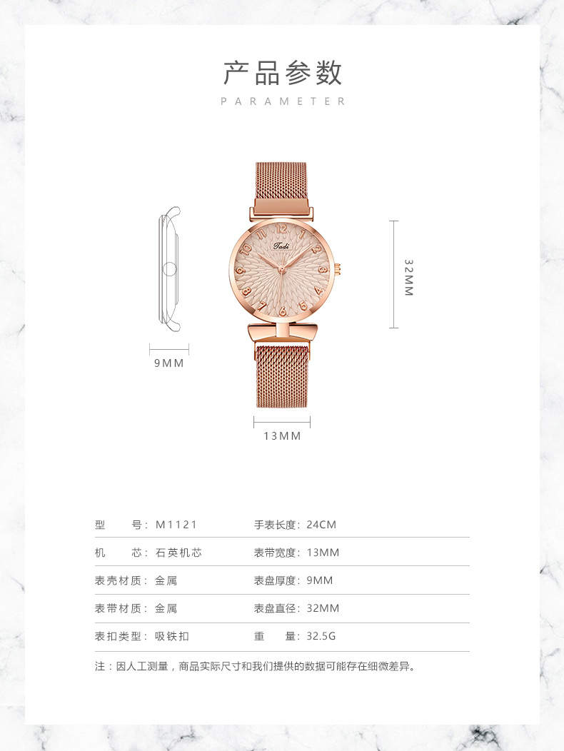 属性:机芯:石英机芯表壳材质:金属表带材质:金属表扣类型:吸铁扣规格:手表长度:240MM表带宽度:13MM;表盘厚度:9MM;表盘直径:32MM;重量:32.5G