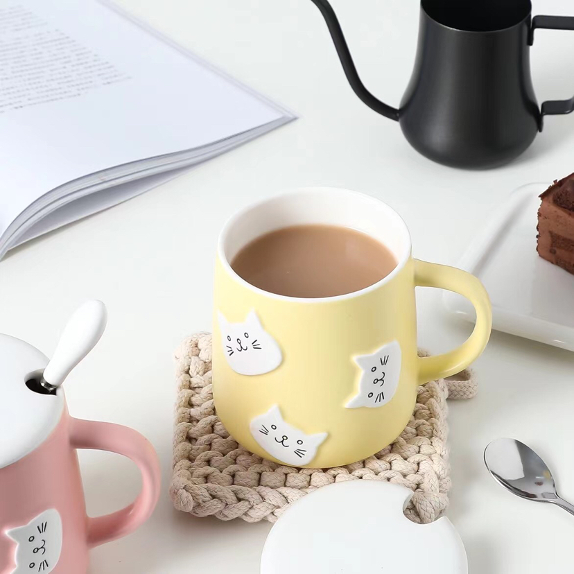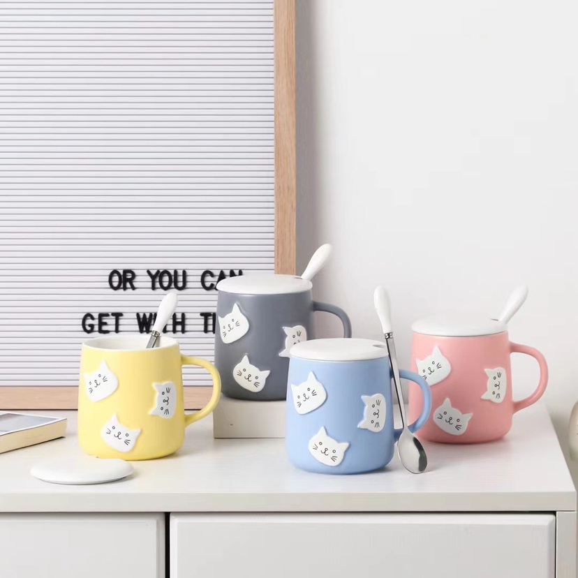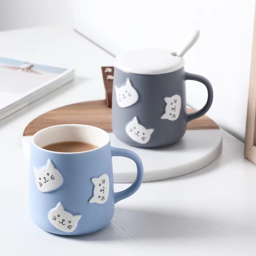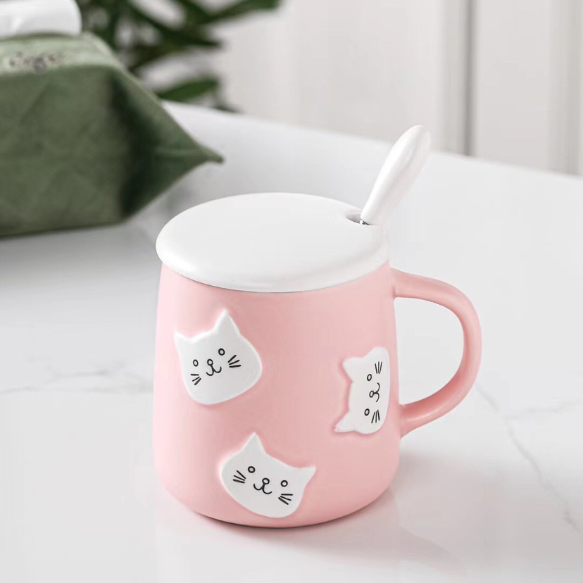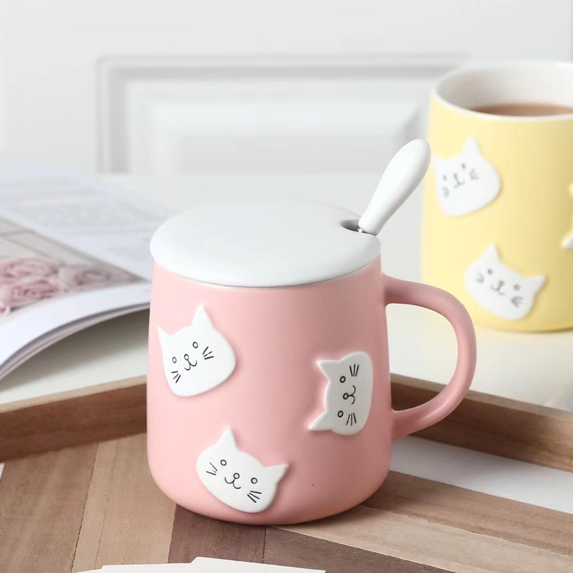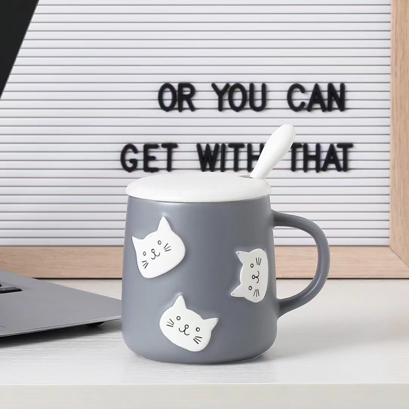 创意立体猫咪头陶瓷杯带盖带勺马克杯卡通水杯