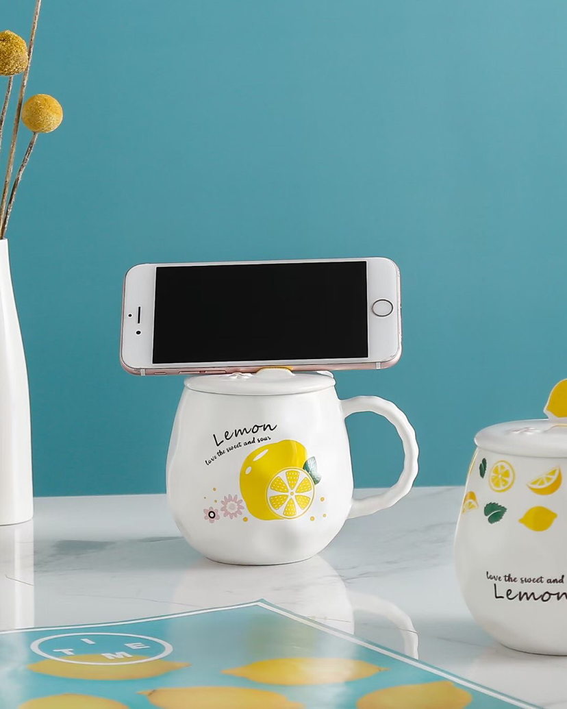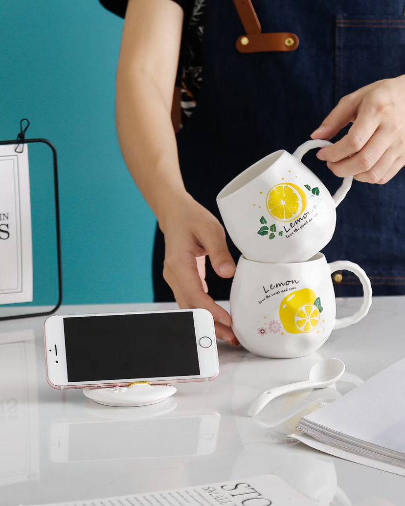 创意小清新水果陶瓷杯带盖带勺马克杯柠檬手机支架水杯