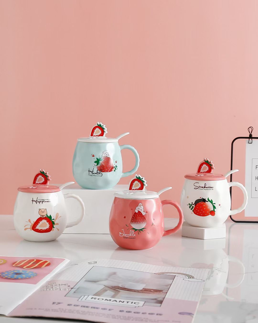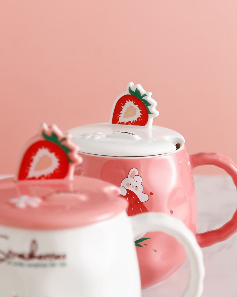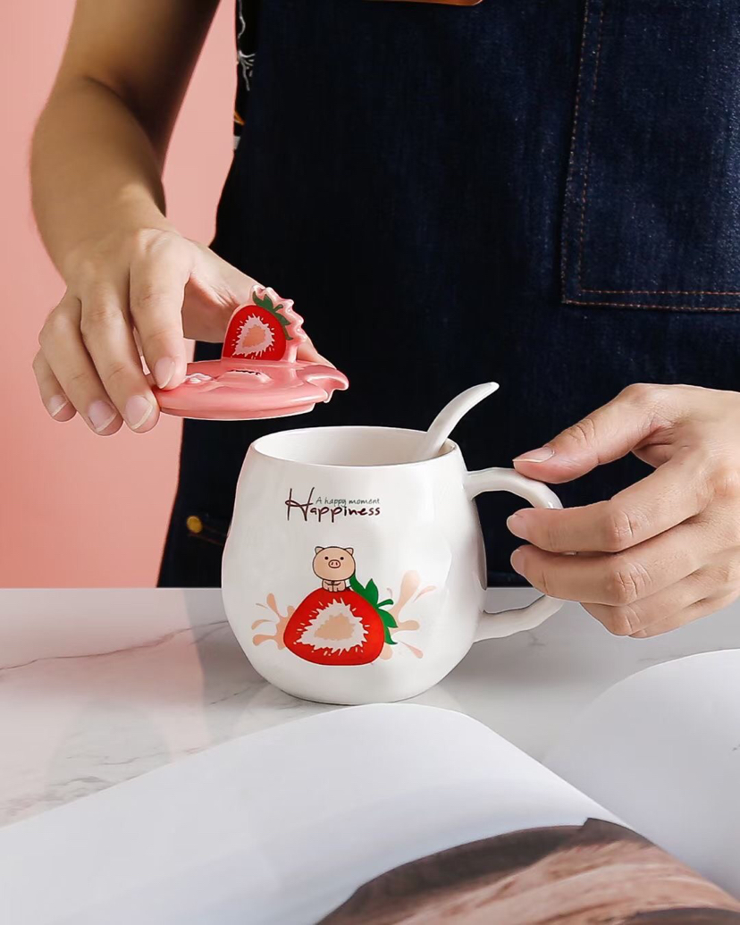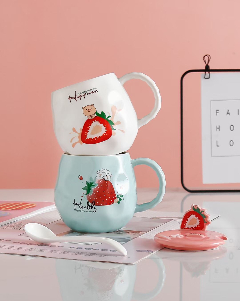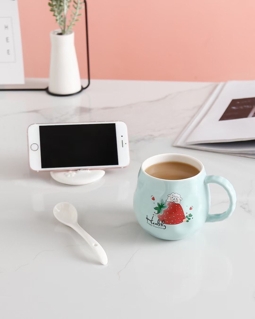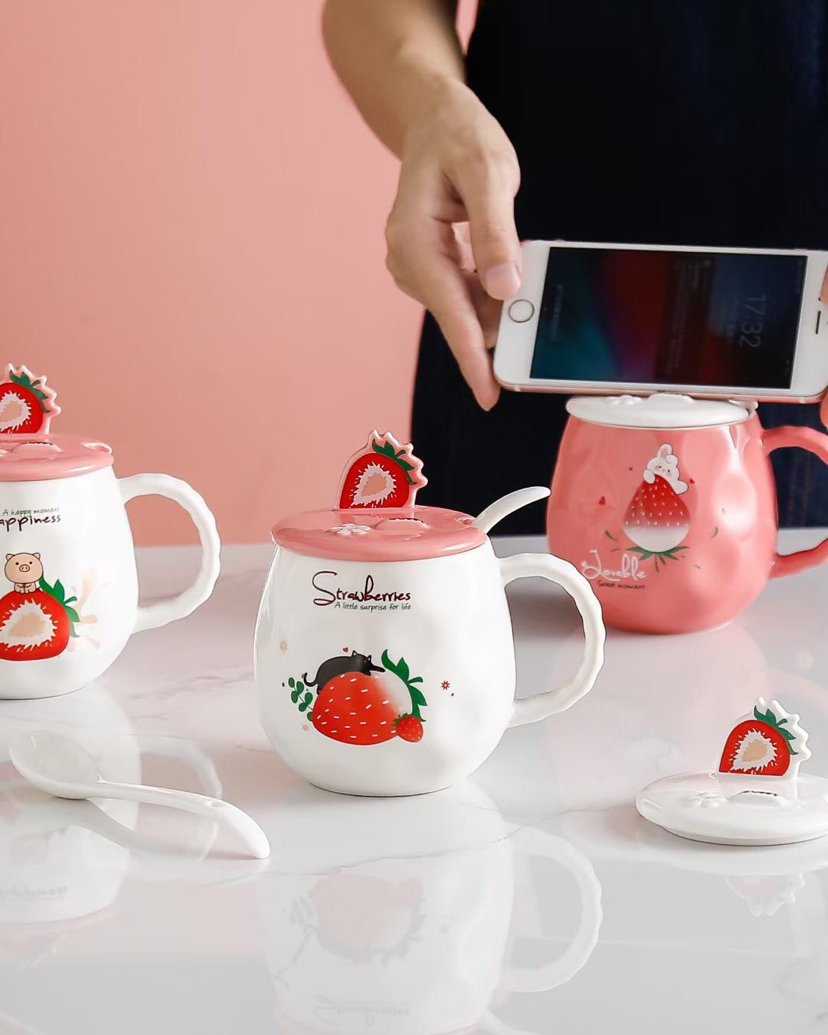 创意水果草莓陶瓷杯带盖带勺马克杯手机支架水杯情侣杯