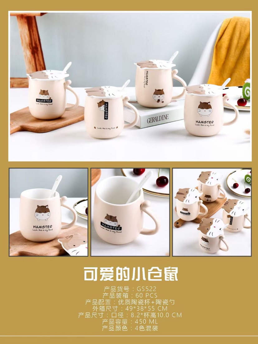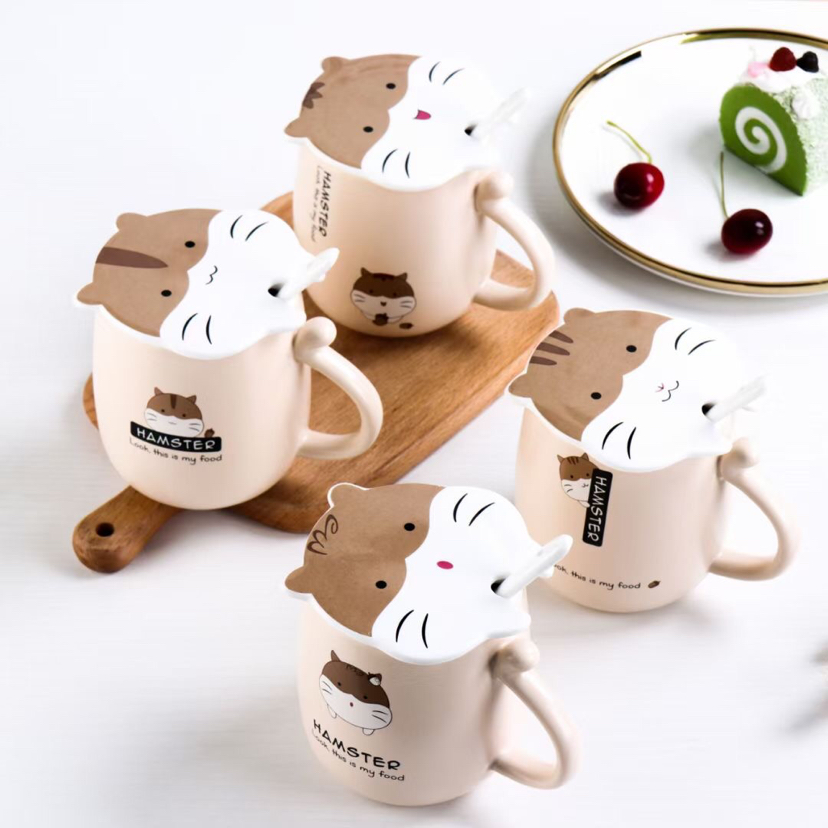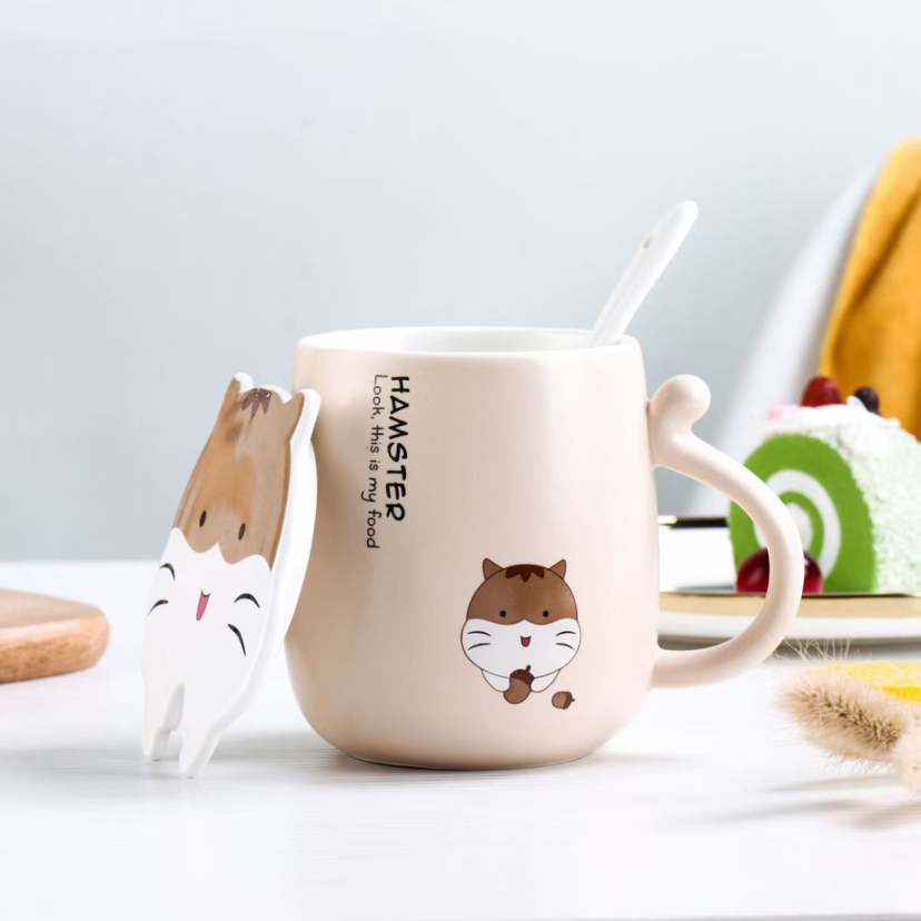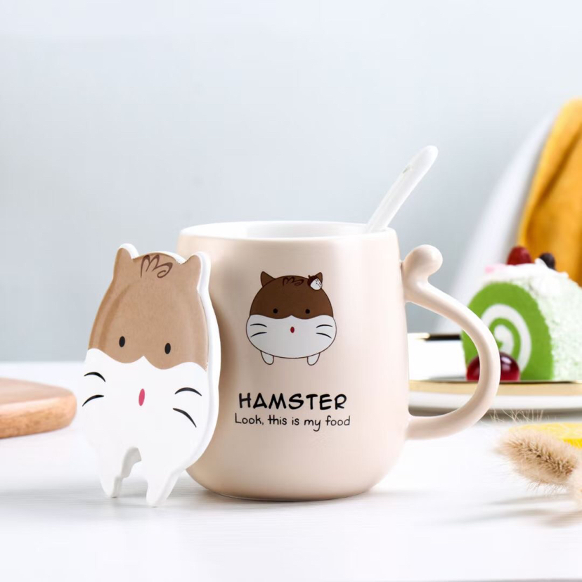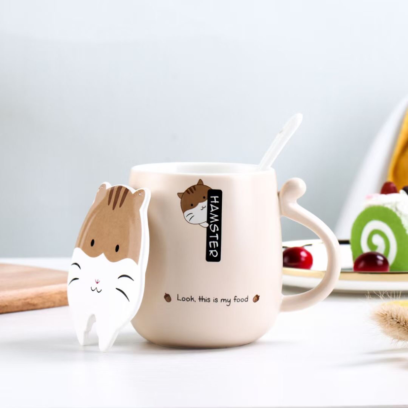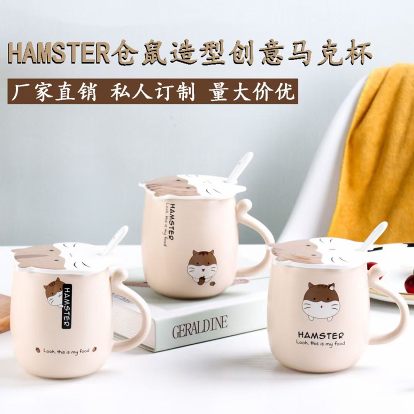 厂家直销卡通仓鼠陶瓷杯创意马克杯带盖带勺咖啡杯可爱水杯