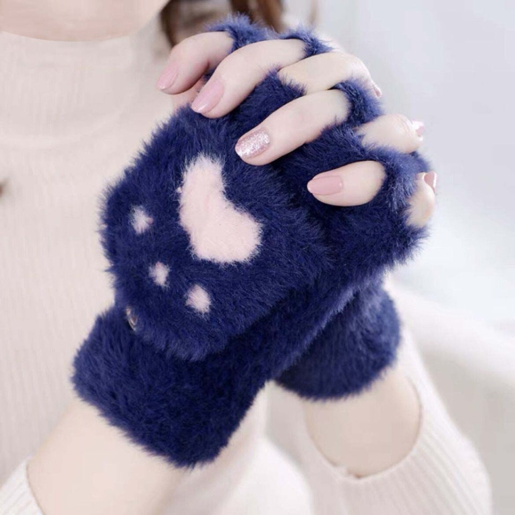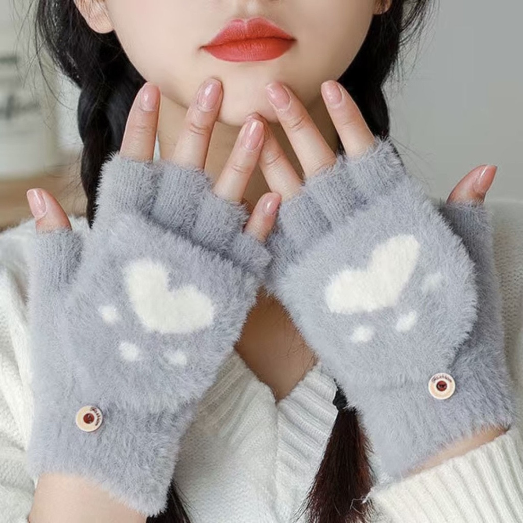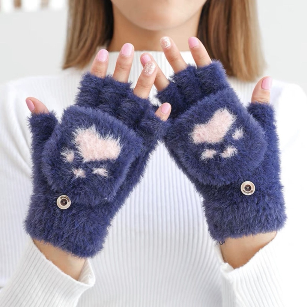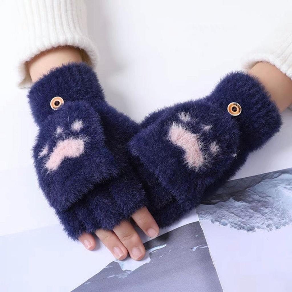 冬季女款熊掌翻盖露指触屏手套