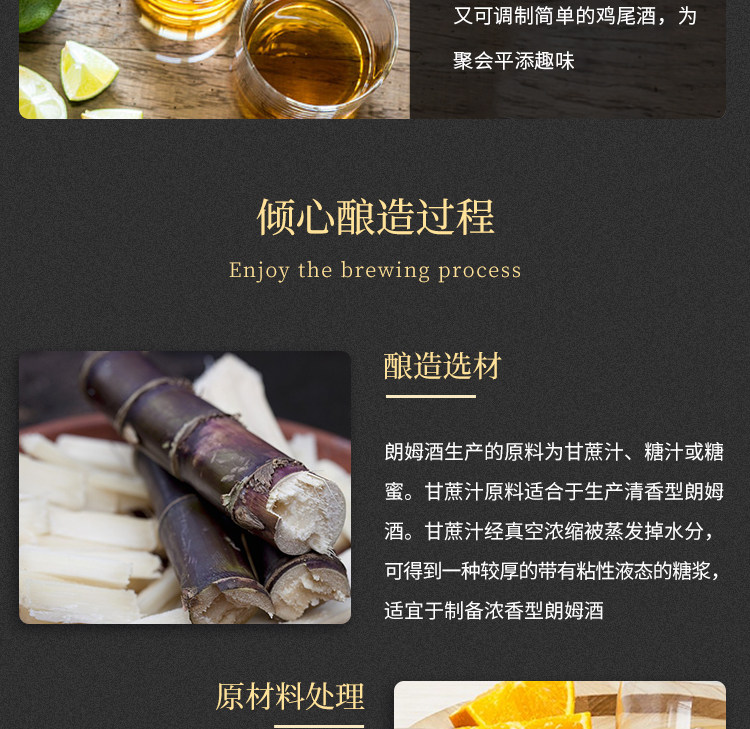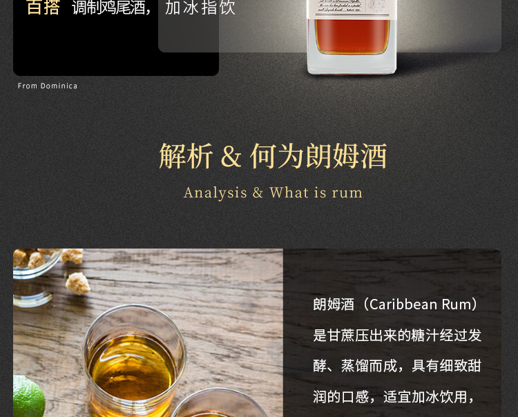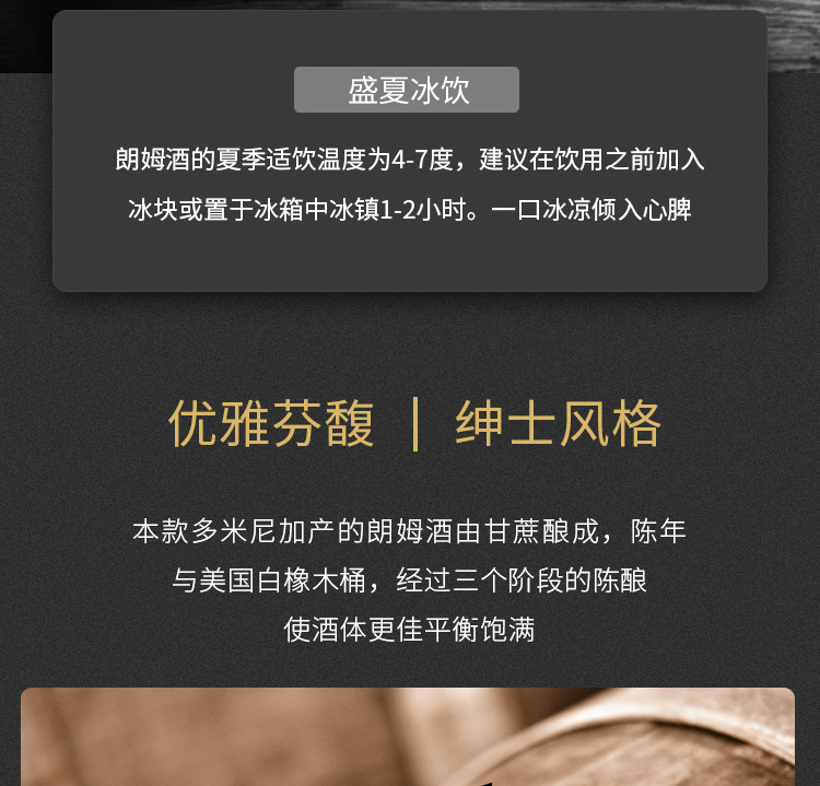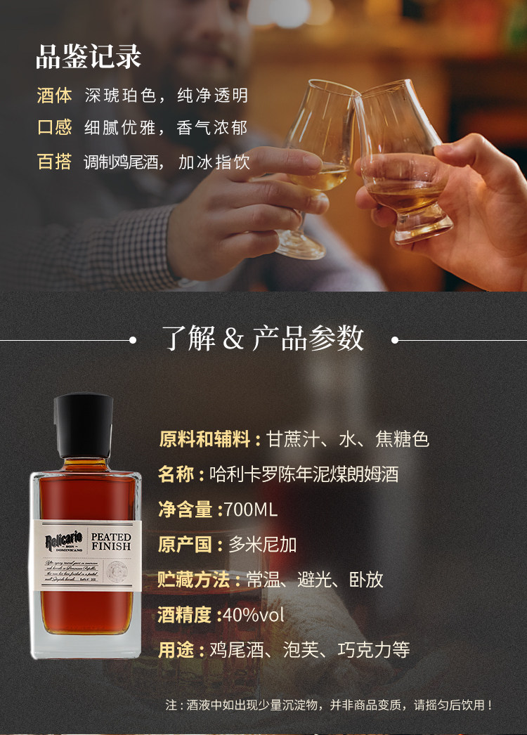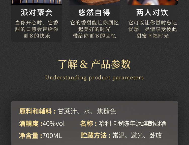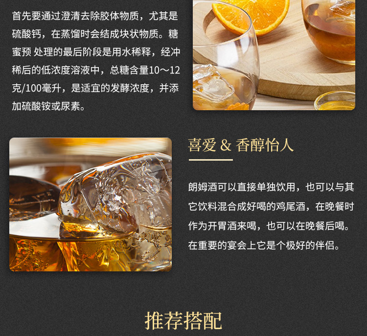 商品简介:酒体呈现透明琥珀色,经过10年陈年的朗姆酒,甘蔗和香草的香味更加浓郁,暗含着烟熏味,泥炭味、麦芽味和单麦芽桶中最后陈酿的坚果味;