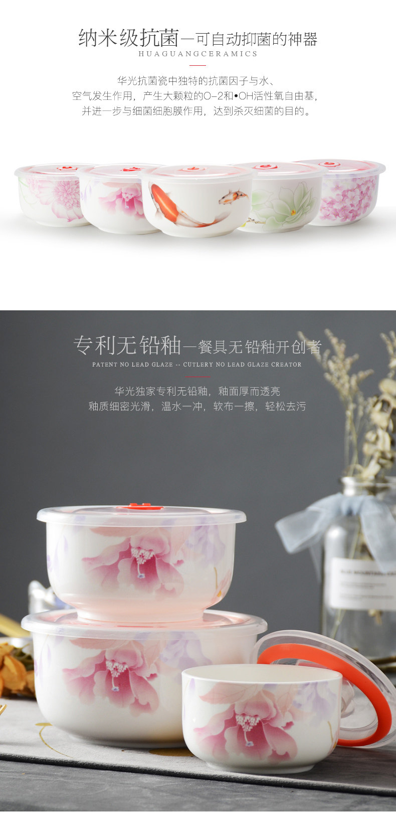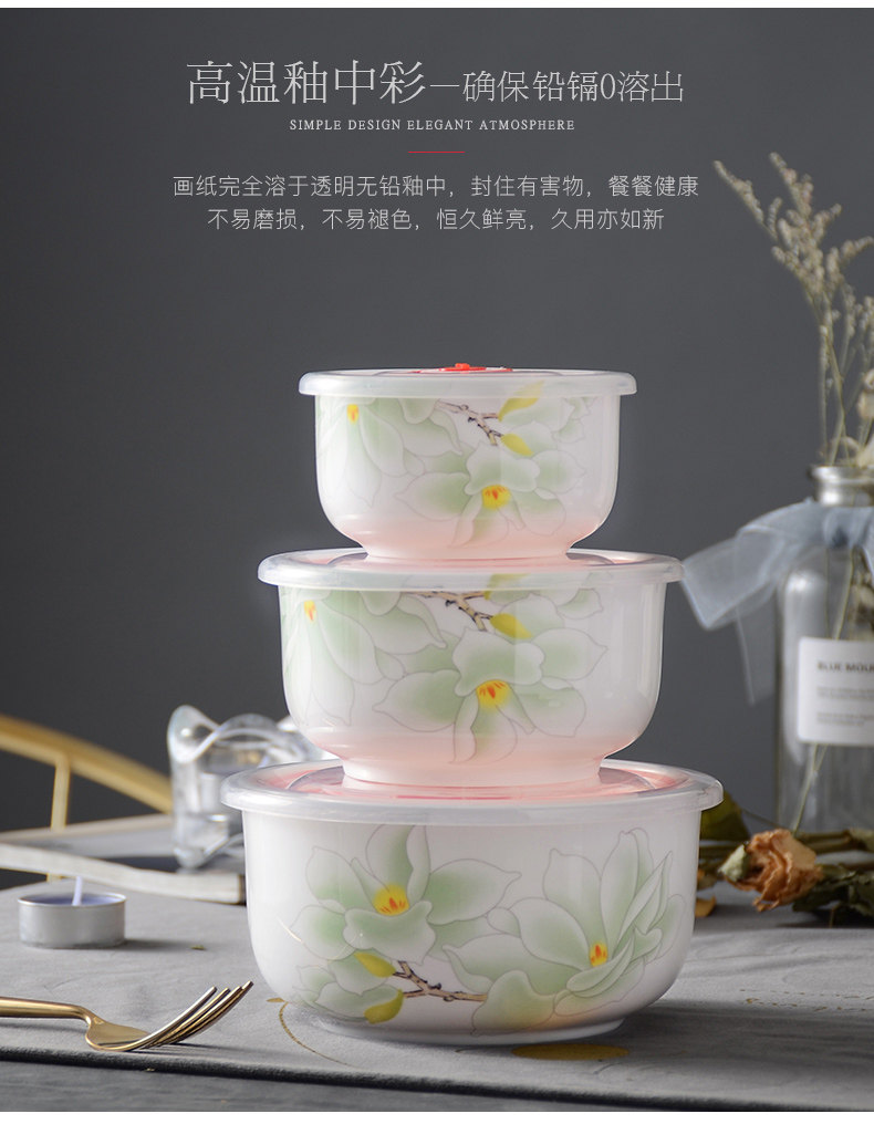 华光陶瓷骨瓷保鲜碗三件套保鲜盒釉中彩微波炉带盖便当饭盒水果盒