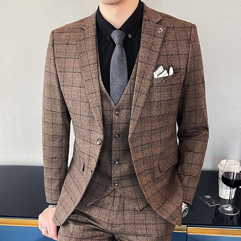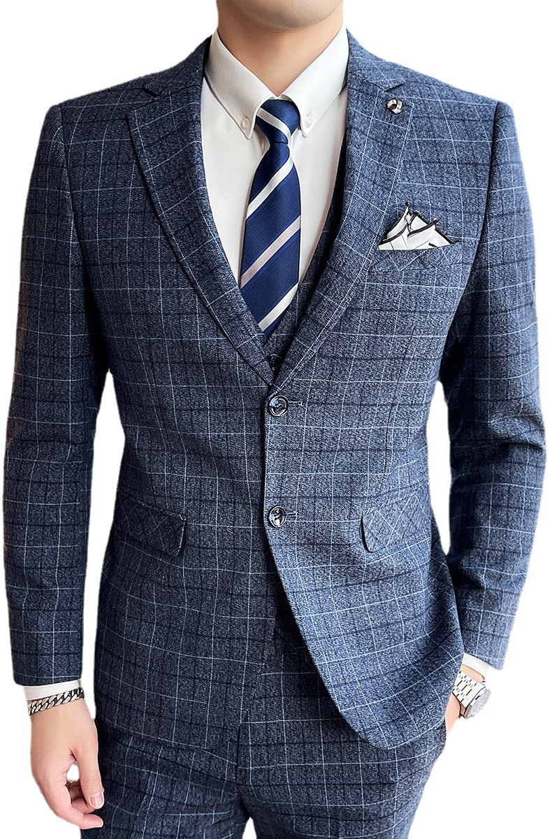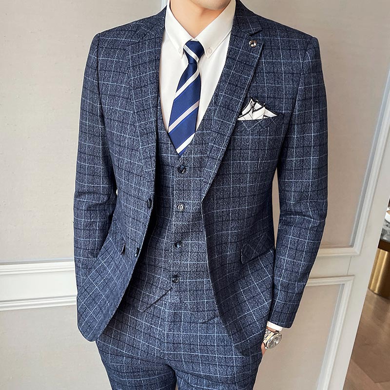 新款型男西装三件套商务正装英伦风时尚修身休闲韩版细格西服外套