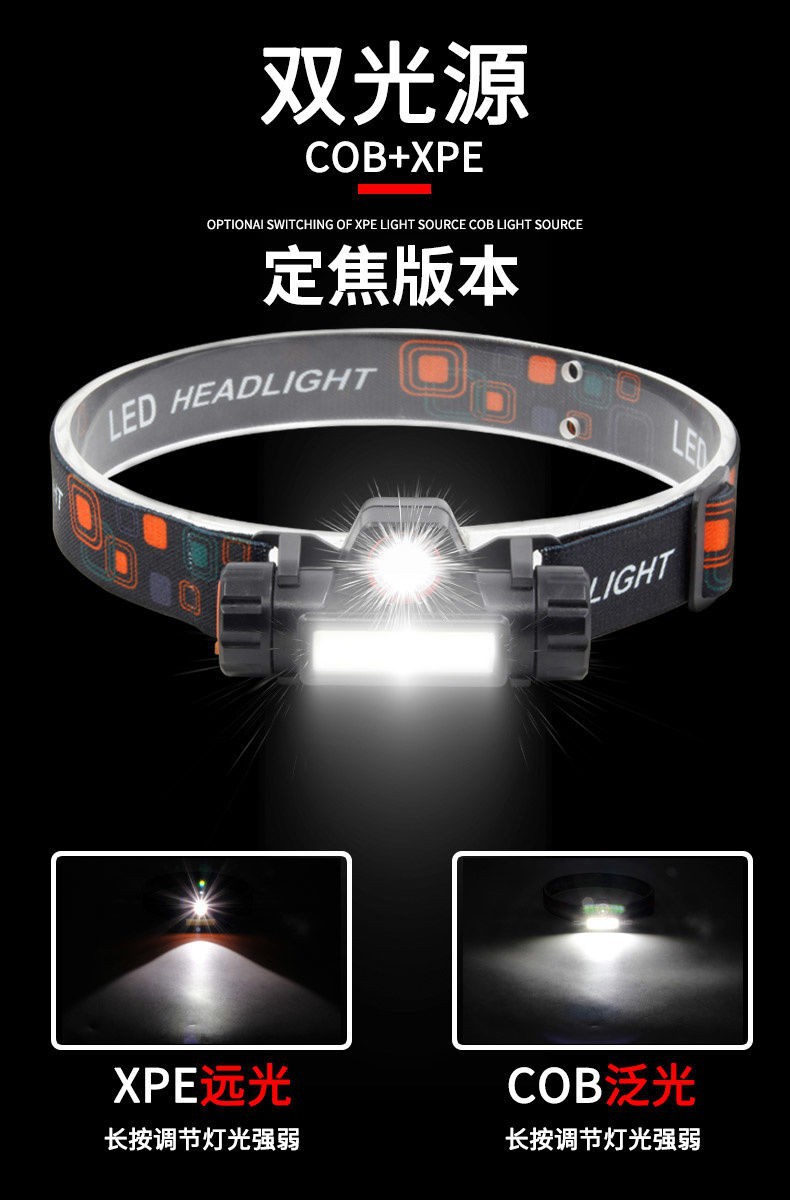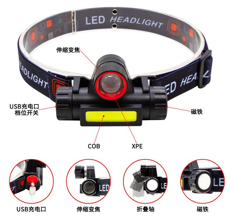 跨境LED户外强光头灯USB充电伸缩变焦防水COB头戴式工作灯钓鱼灯