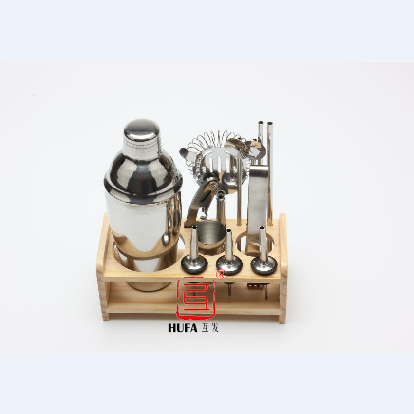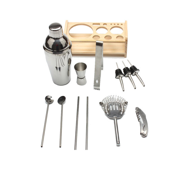 内含:550ml摇酒器,15/30量酒器,冰块夹,滤冰器,2pcs调酒匙,海马刀,3pcs倒酒器,2pcs吸管,木架