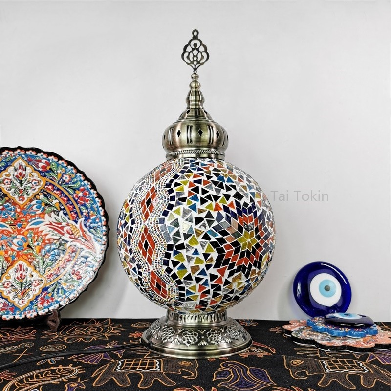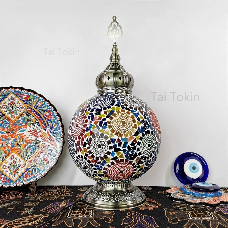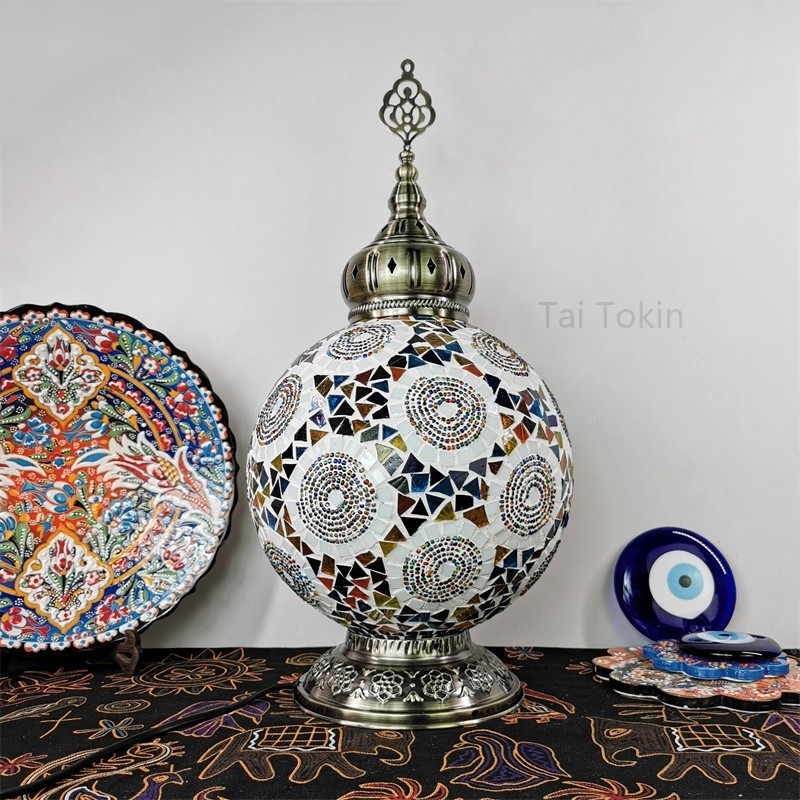 【2019深秋新品】新款土耳其风格台灯,我们把原色琉璃进一步升级,颜色更为鲜艳。由于仿品太多,我们把图案更加复杂化,新的图案更加异域,也更加美观大气。金属方面我们采用了土耳其原汁原味的顶部花纹金属,浓郁的土耳其味道。增加顶部金属以后,整灯开起来更加大方,更加异域。