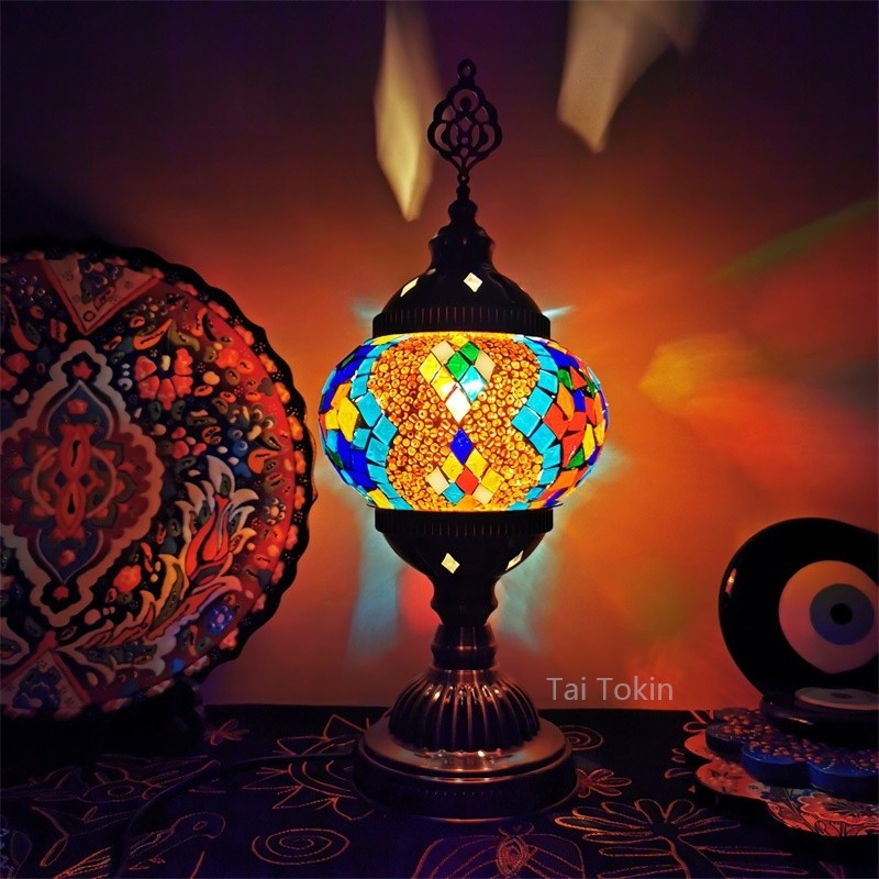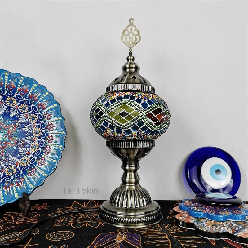 【2019深秋新品】新款土耳其风格台灯,我们把原色琉璃进一步升级,颜色更为鲜艳。由于仿品太多,我们把图案更加复杂化,新的图案更加异域,也更加美观大气。金属方面我们采用了土耳其原汁原味的顶部花纹金属,浓郁的土耳其味道。增加顶部金属以后,整灯开起来更加大方,更加异域。
