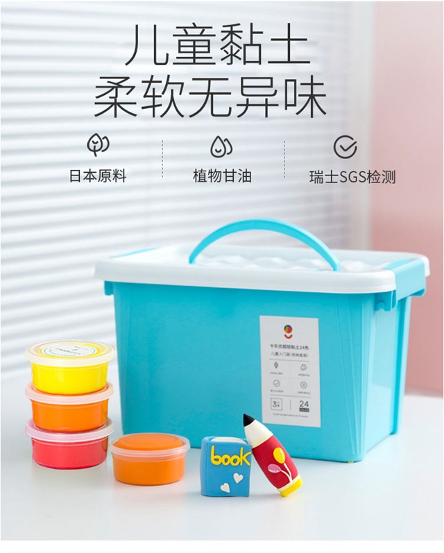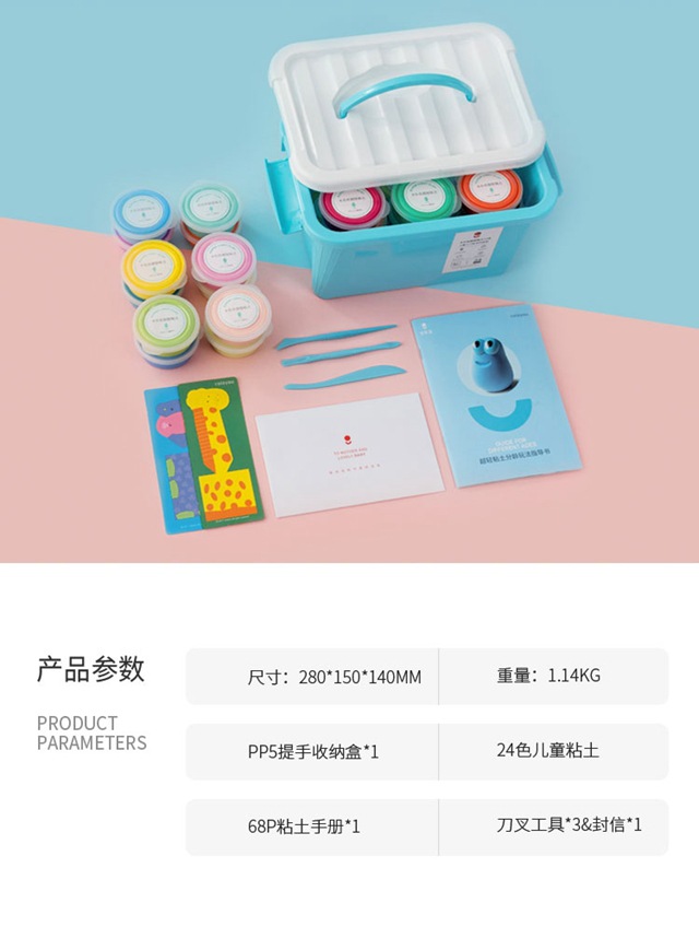 | 24色粘土 小粉/小蓝收纳箱 | 1、中杯装粘土*24杯 2、粘土玩法引导书*1本 3、粘土刀叉工具*1套 | 包装尺寸(mm): 单包重量:约8g | 18 |