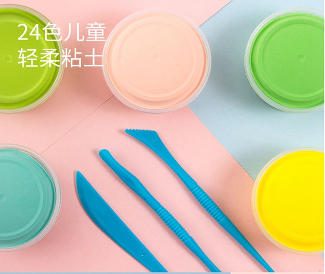 | 24色简易装 | 1、大杯装粘土*24杯 2、粘土玩法引导书*1本 3、粘土刀叉工具*1套 | 包装尺寸(mm): 单包重量:约15g | 20 |