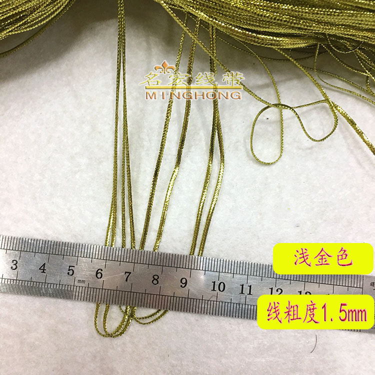 \ \该宝贝全部由12锭机器金丝线编织而成 为扁平空心状 无心无弹力,约1.5MM宽度,由于线带属性不同于其他成品销售, 米数有稍许误差属正常现象介意者慎拍!扁金线适合做各种吊牌线 ,绑海参人参金线 礼品包装设计 圣诞礼品包装和民族服装辅料有现货包邮 偏远地区不包 ,本店厂家直销实体店线上线下兼营,有需要的亲旺旺联系店主或电话联系!店内还有其他线带产品需要的亲可收藏本店或旺旺咨询店主,本店还可订制其他规格长度,厂家用户量大价格更优惠。