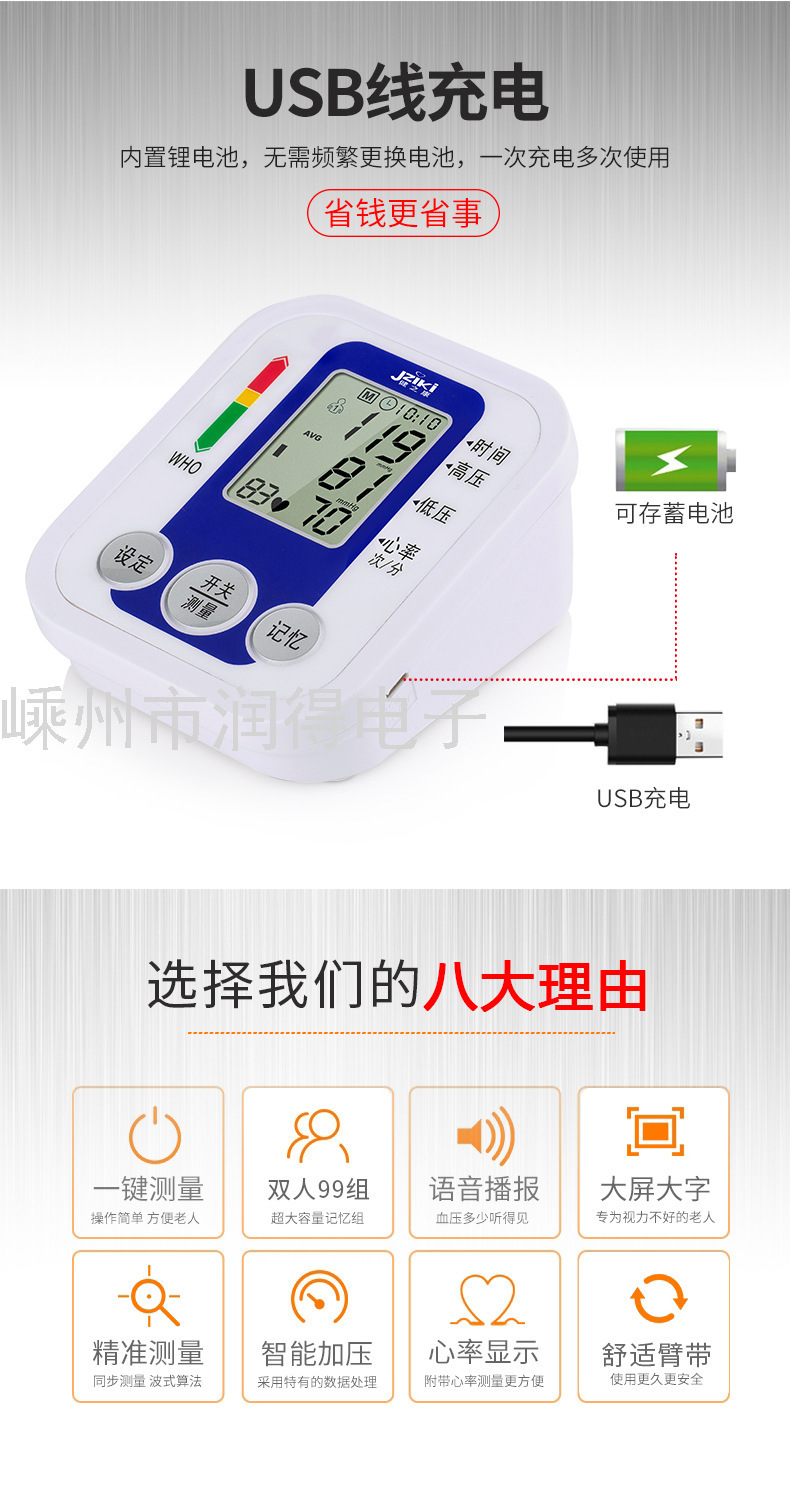 专供出口 JZIKI血压计臂式血压计无语音有语音USB插口869 投诉