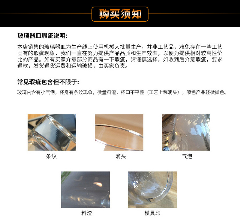 本公司产品只批发不零售,但是金额达到500元支持混批。由于批发数量多货物体积大所以只发物流自己提货,如果需要送货上门物流要另收送货费,(样板件除外)。红酒杯等易碎货物购买前建议支付10元一箱的木架费用,收到货物如有破损请在物流公司拆箱检验,把损坏货物放一起拍照给客服,(3%以外的破损由我们赔付给您)3%以内属于批发运输的正常破损。因为是玻璃易碎品,破损问题不可超过24小时以内,超过时间后果自负哦!!!运费建议客户提货付给物流,这样至少物流在没收到运费前态度会更好一些。我们支持无理由退货,运输过程的破损和运费需买家承担(加工过LOGO的产品除外)。手工产品会有少许的气泡和水纹属于正常现象,追求完美的亲们请谨慎购买!!!!