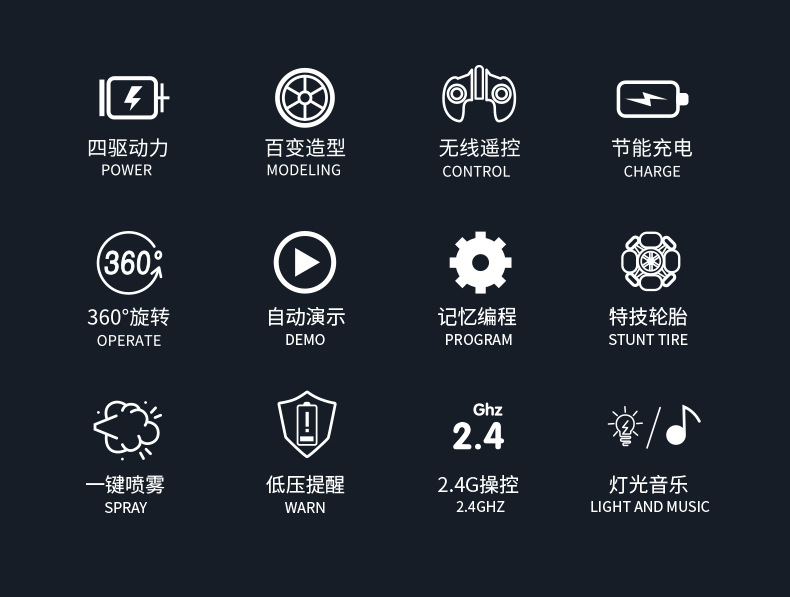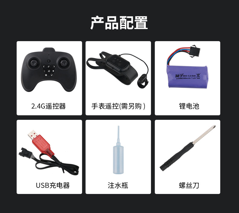 本产品内含配件包: 1、螺螺丝刀 2、车身充电线 3、水瓶