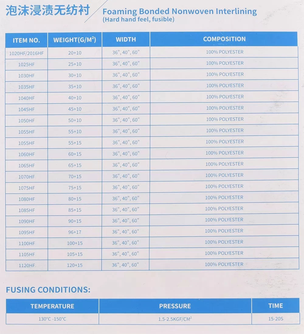 有专门的产品实样册。以硬手感居多,用途广泛:可替代有纺衬,当服装内衬用,绣花用。门幅/包装,可以按客人要求定制。主要是白色和黑色两种。
