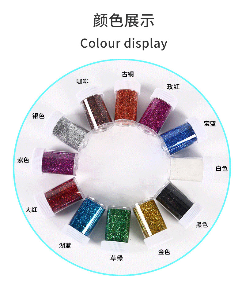 厂家批发新款热卖12色PET金葱粉20克瓶闪光粉亮粉耐高温美甲亮片专供出口 English | 投诉