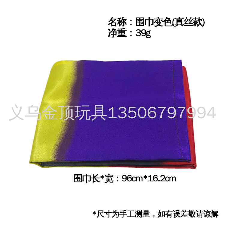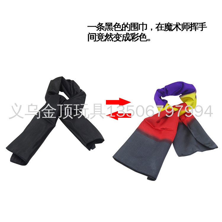 魔术效果:一条黑色的围巾只要甩动一下马上就变成几种颜色的围巾,也可以当普通围巾使用围在勃子上,但你的朋友突然要求你表演个魔术的时候你就可以大显身手了