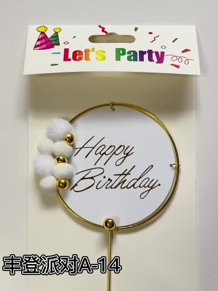 温柔古风棉花球带金色装饰球生日快乐蛋糕插件派对用品拍照道具