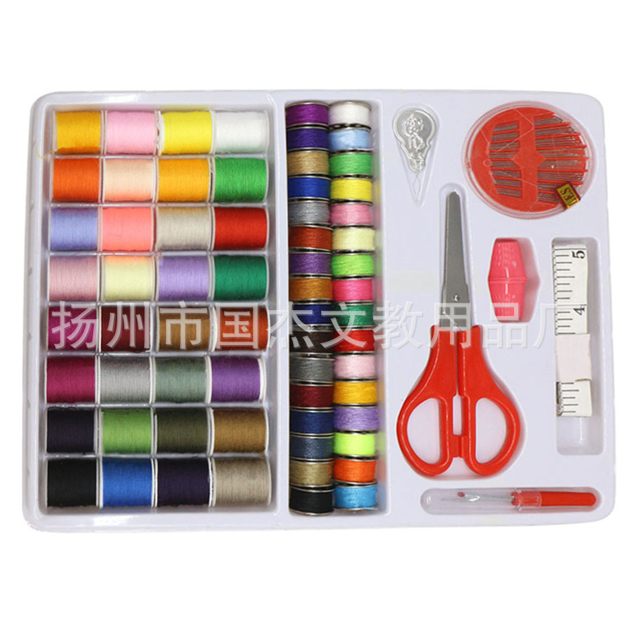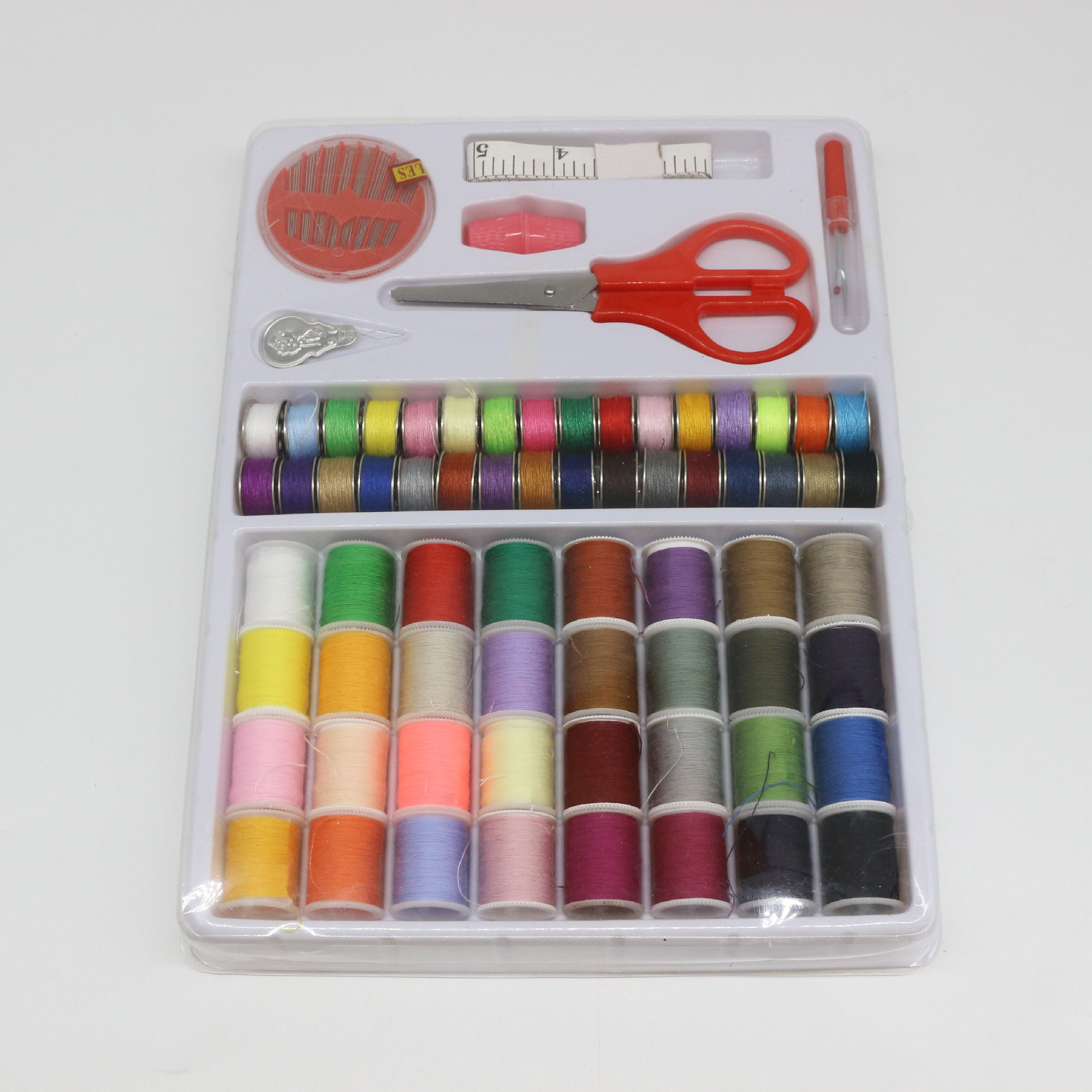 优质精美针线盒:32个金属梭心32小线团,一只小剪刀,一只拆线刀,一个穿针 器,二个塑料顶针套,一条皮尺,手缝针一盒,吸塑盒包装,外面套白盒发货。