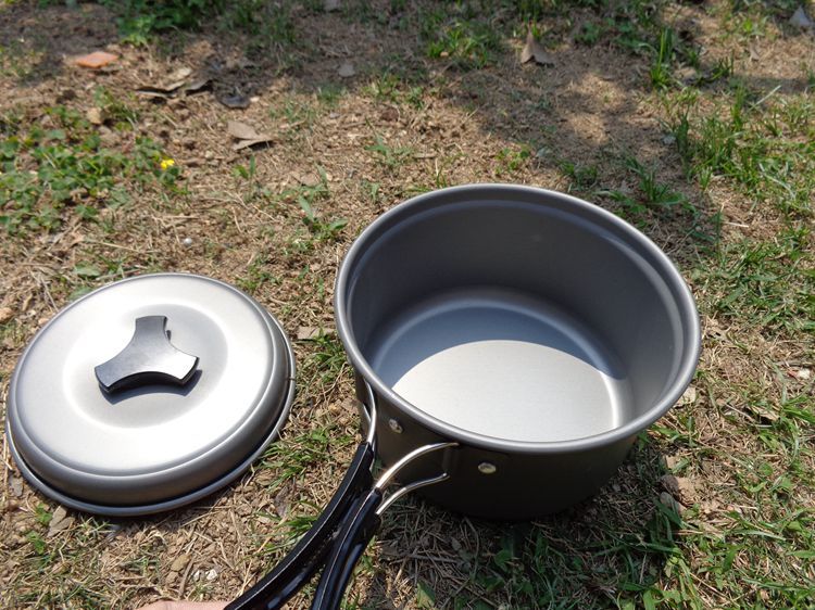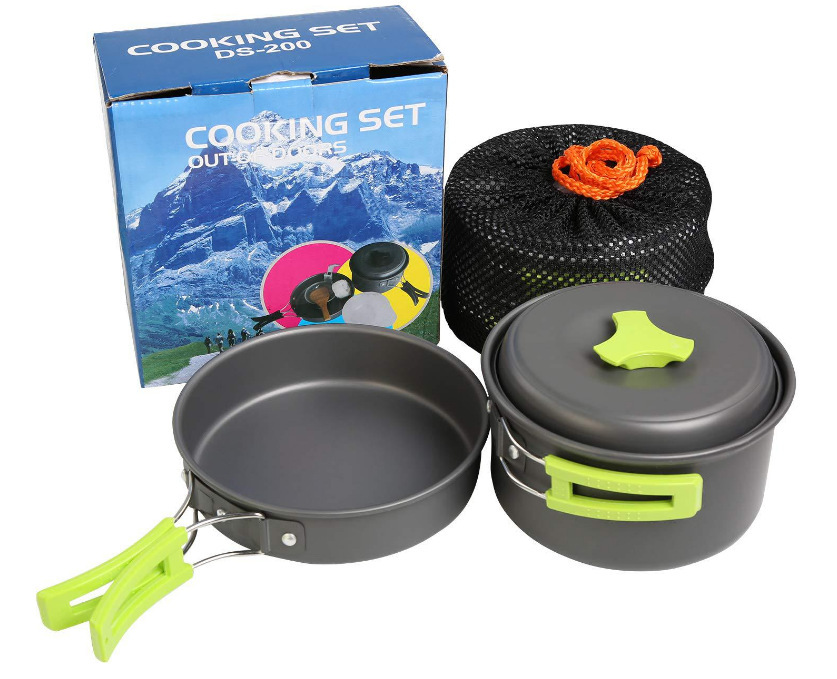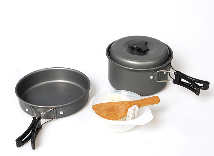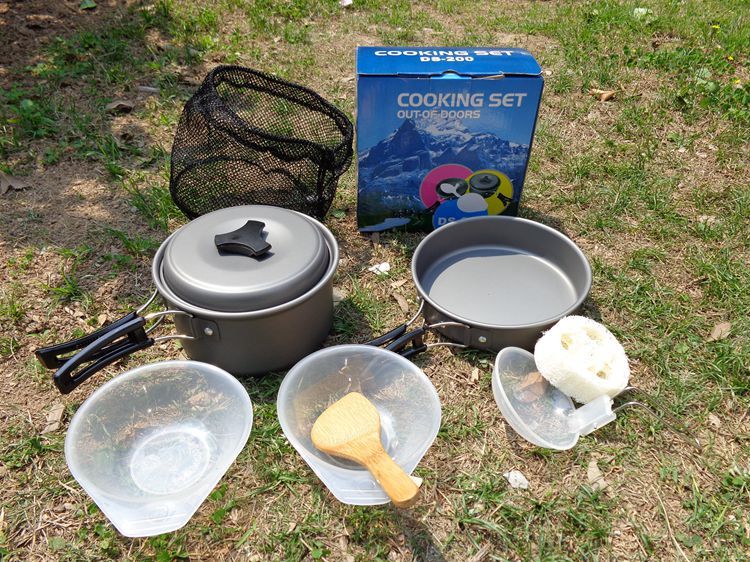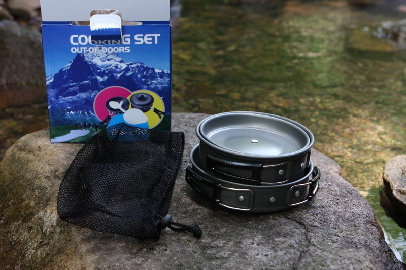 适合1~2人使用,包括一个小锅和煎锅,一汤匙,一饭勺,二碗。采用进口铝材,高级硬质铝氧化,耐高温、磨擦。汤匙;饭勺、碗采用高硬度材料,耐高温。黑色网袋及纸盒包装。