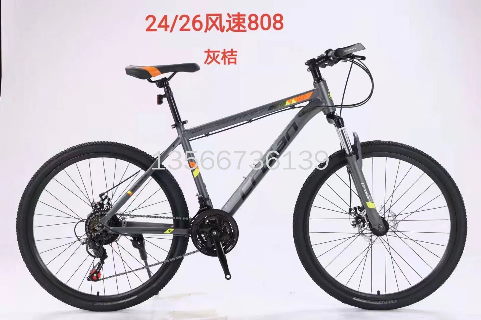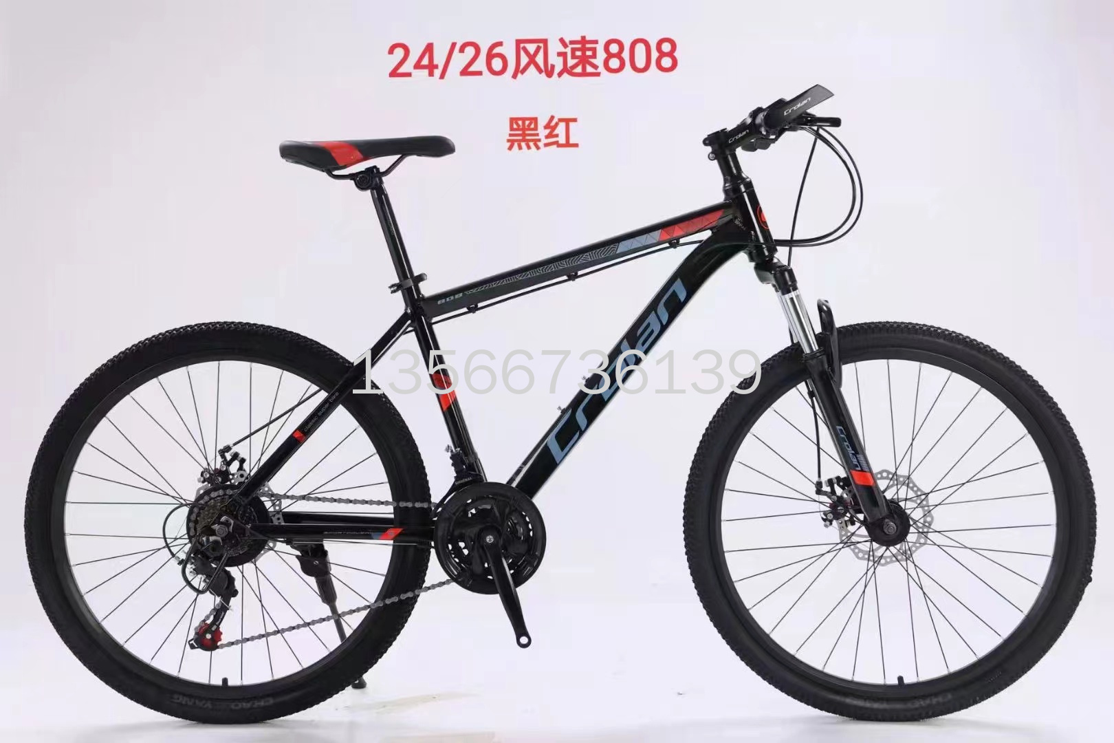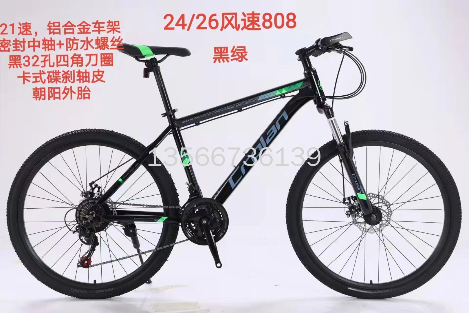 山地自行车,24/26寸,变速自行车,禧玛诺变速自行车,男女通用,21速自行车风速808,铝合金车架,密封中轴+防水螺丝,黑32孔四角刀圈,卡式碟刹轴皮。本店不支持七天无理由退换货。