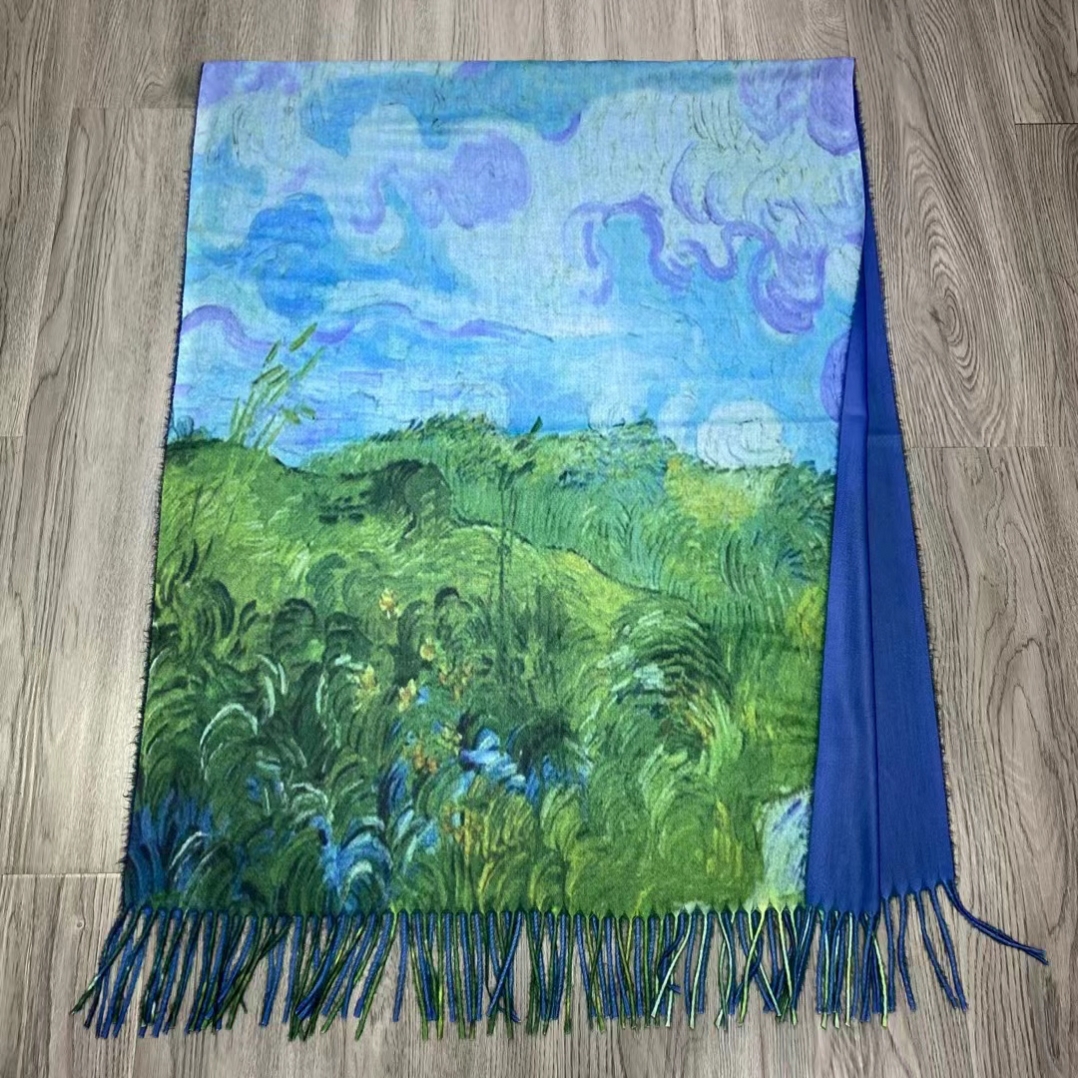 秋冬季仿羊绒数码印花围巾女 长款油画披肩 百搭装饰流苏围巾 English | 投诉