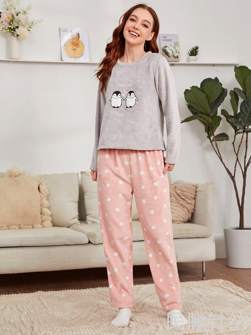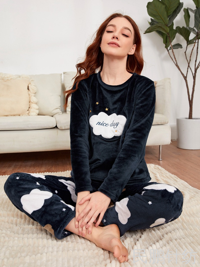 民鹏欧美胸前绣花睡衣套装女款家居服情侣睡袍暖暖衣裤秋冬珊瑚绒