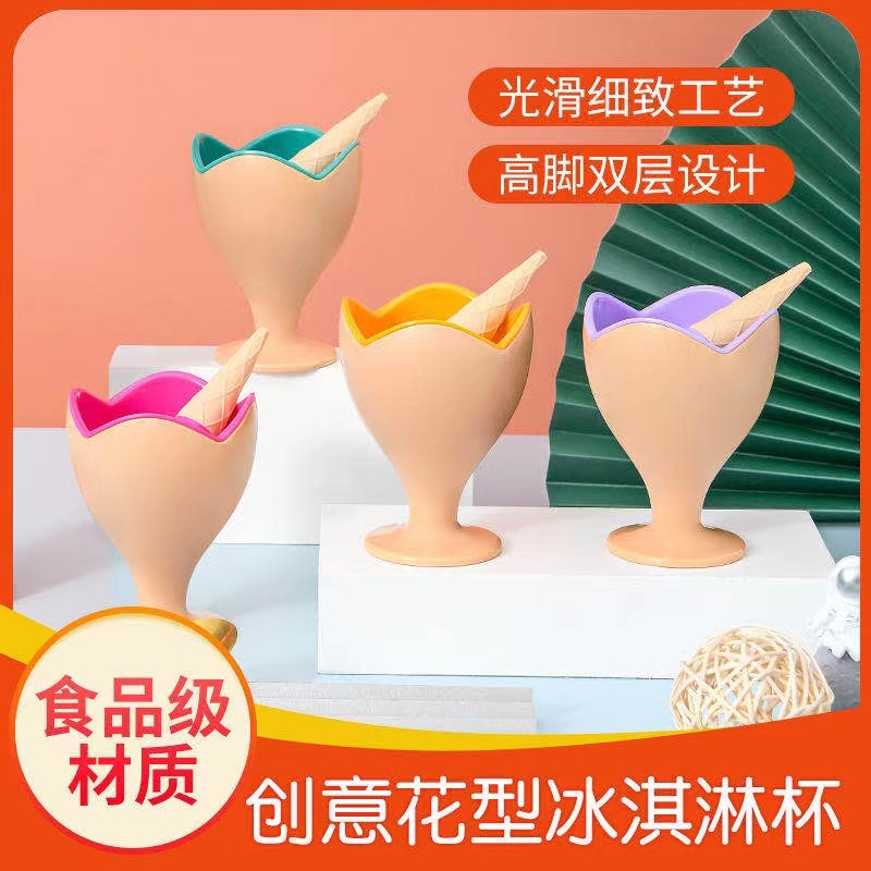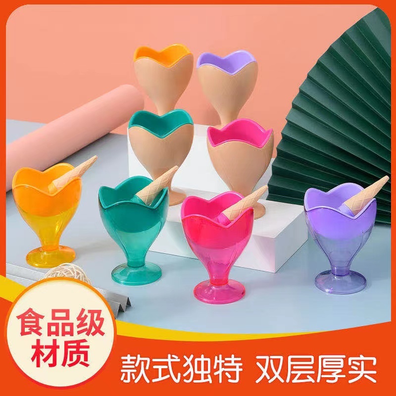 创意花型冰淇淋杯家用甜品奶昔雪糕碗勺套装透明实色食品级冷饮杯