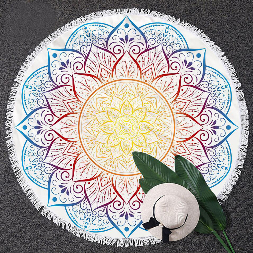 毓喜厂家直供圆形印花沙滩巾纤维加流苏手感软可来图曼陀罗