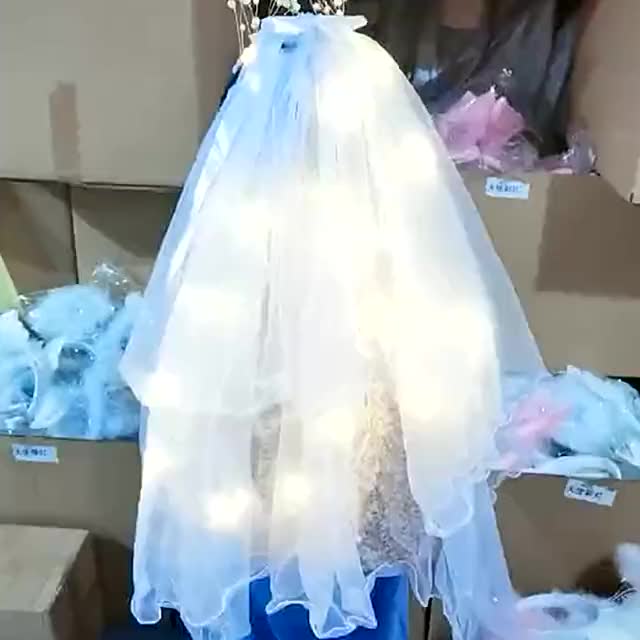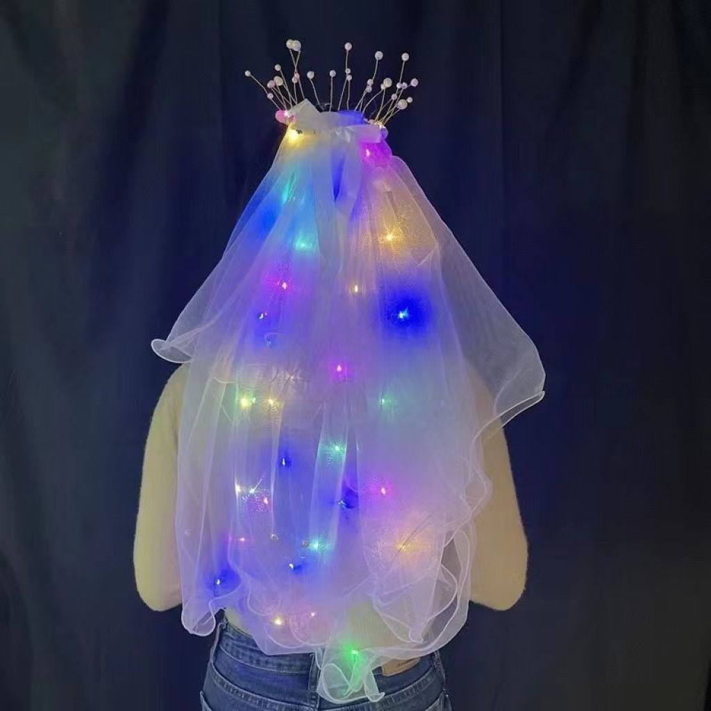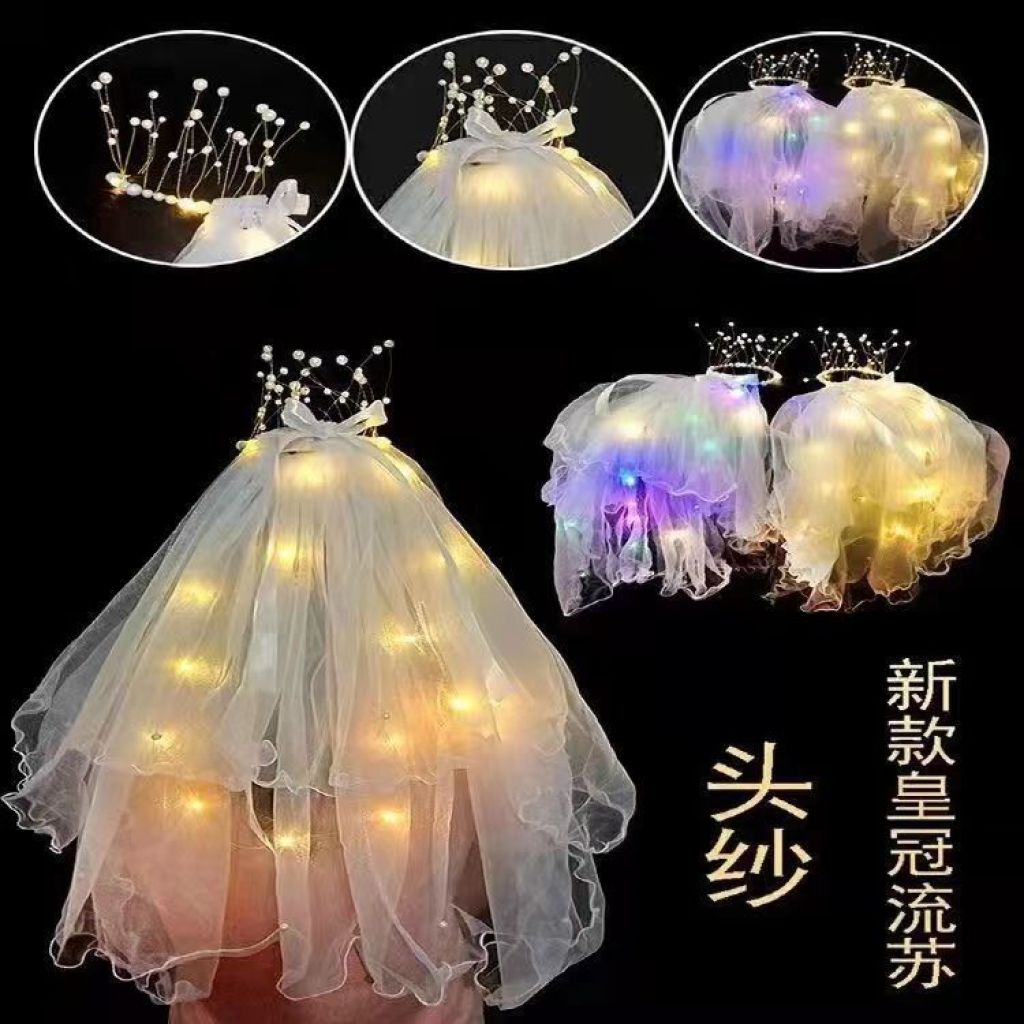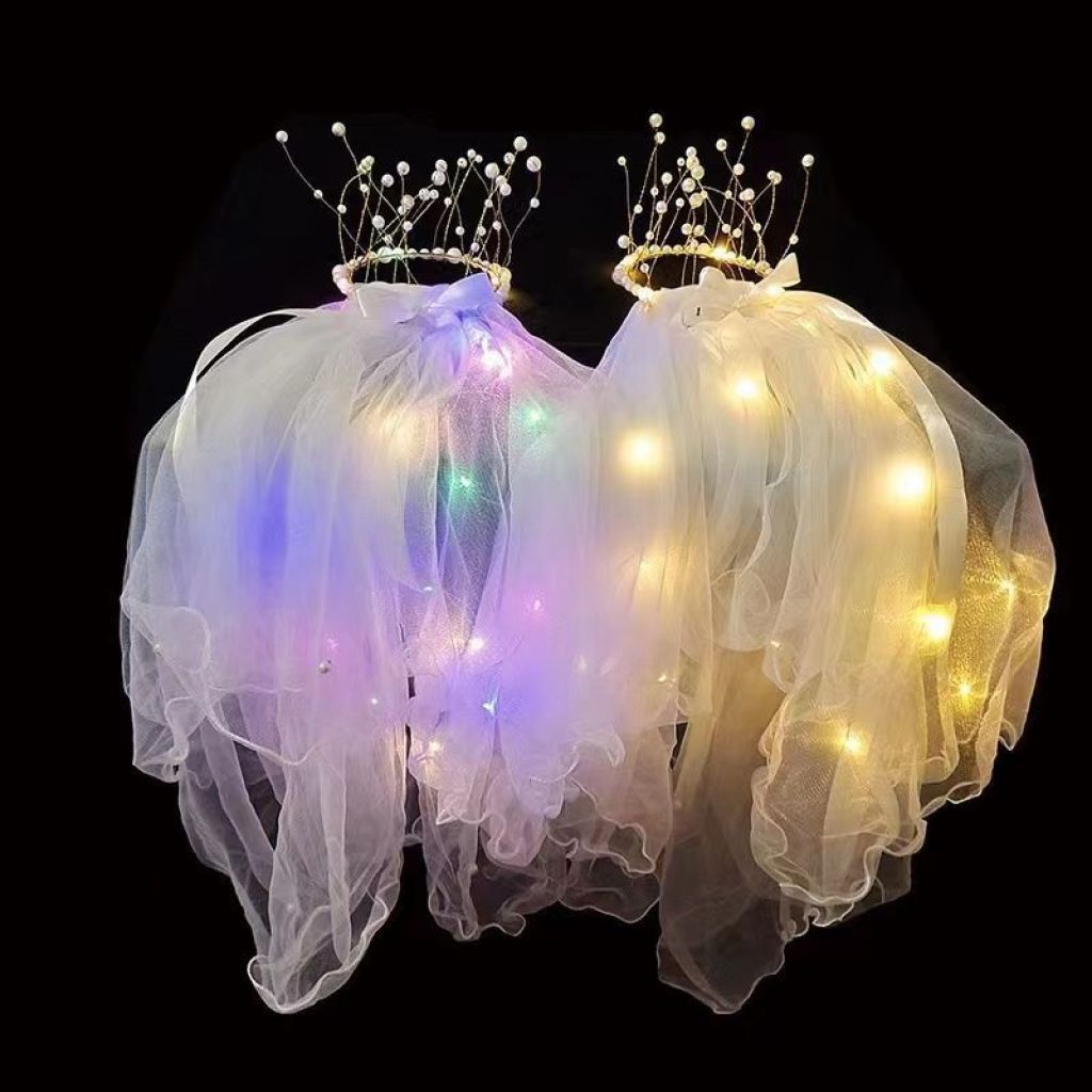 包邮新品发光流苏头纱带珍珠超仙女儿童新娘头纱发光头饰地摊批发 投诉