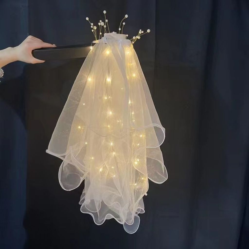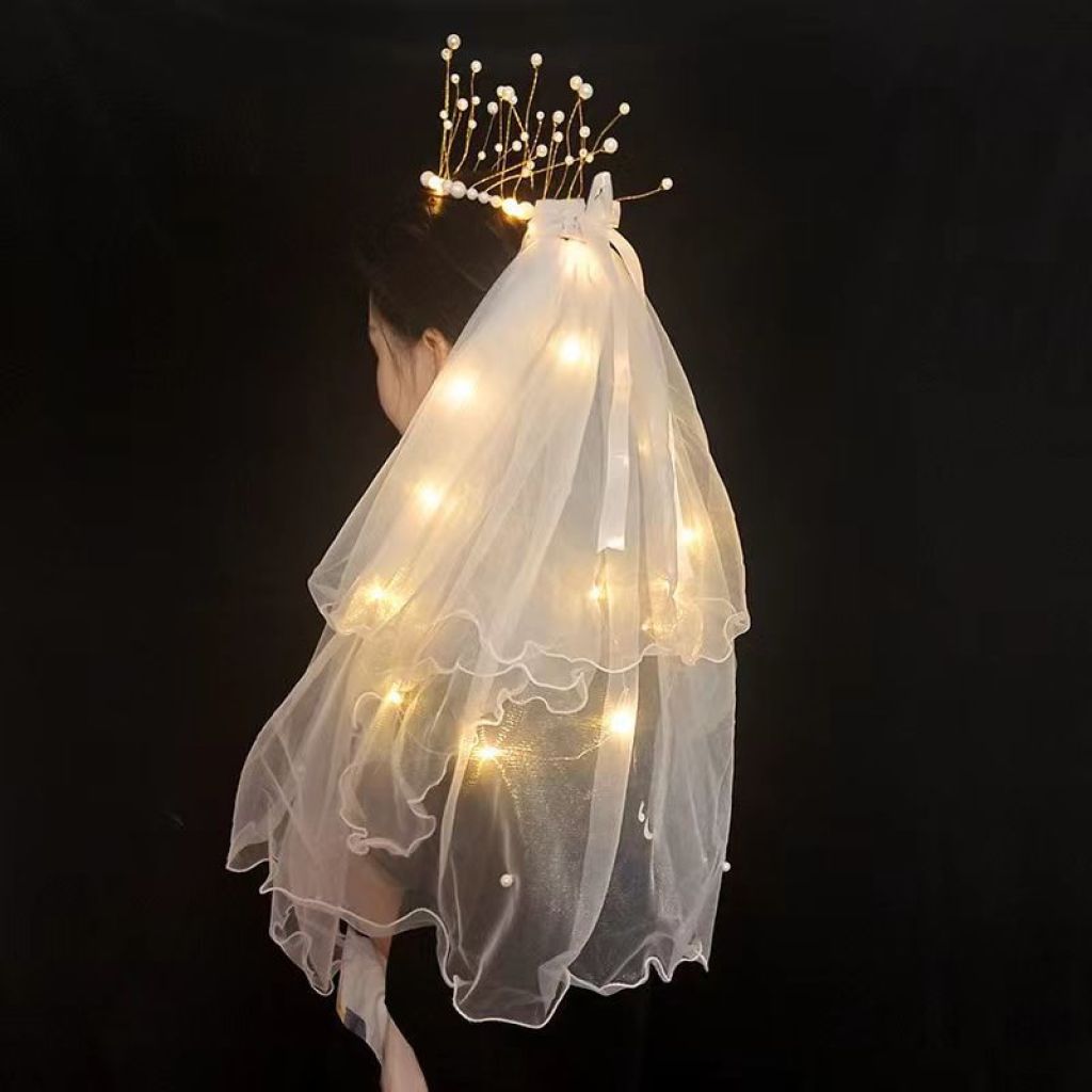 包邮新品发光流苏头纱带珍珠超仙女儿童新娘头纱发光头饰地摊批发