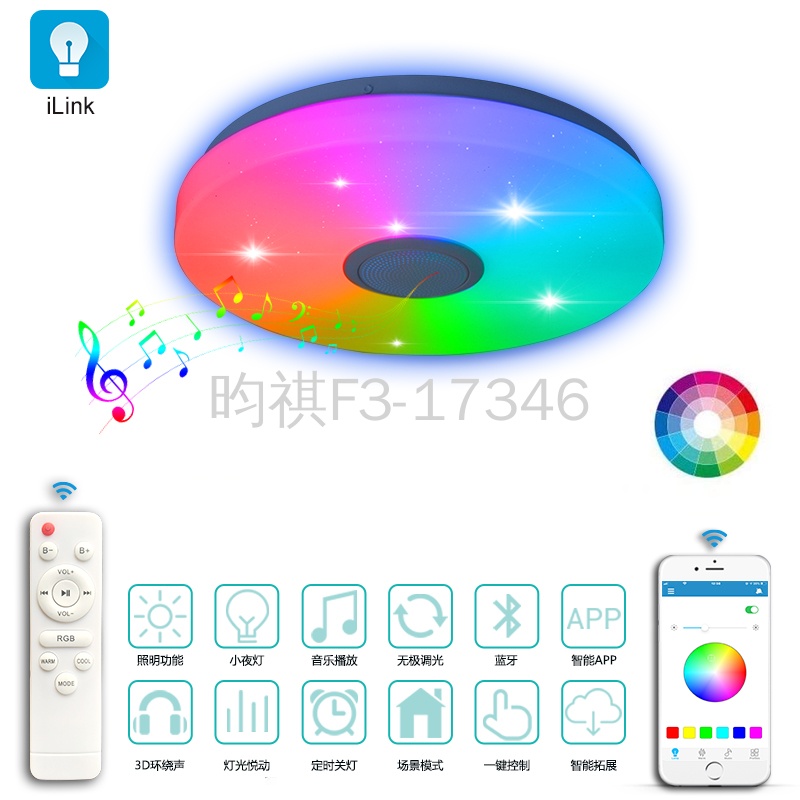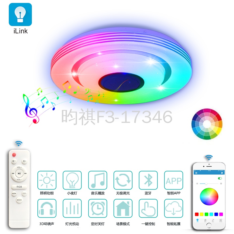 APP: iLink控制,主光源60W,RGB10W 无极调光,音乐播放,彩光效果,定时关灯等,儿童早教,音乐律动,带遥控控制,白色或黑色一体喇叭网罩,幻彩效果